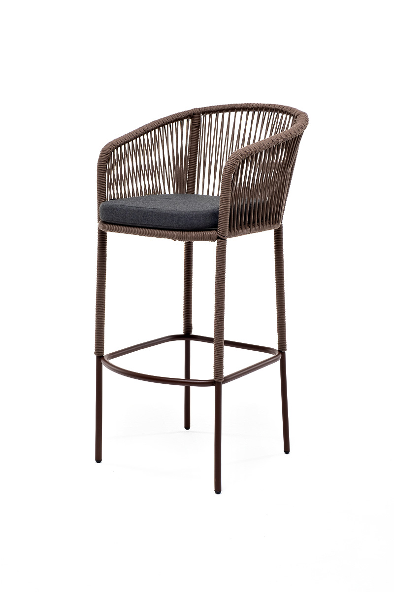 "Марсель" стул барный плетеный из роупа, каркас из стали коричневый (RAL8016) муар, роуп коричневый круглый, ткань темно-серая