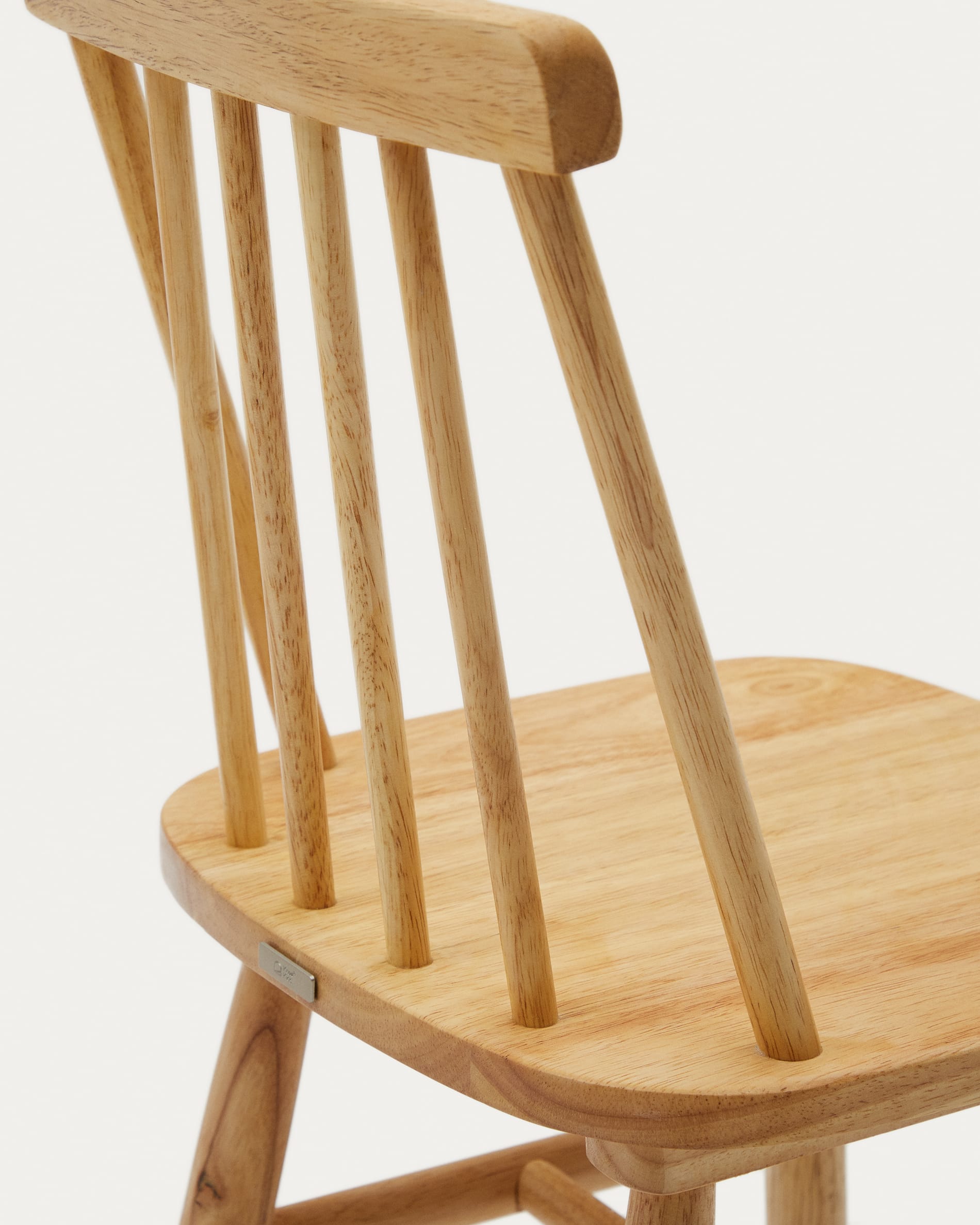 Стул полностью сделан из каучукового дерева, имеет традиционную форму и конструкцию. Сиденье с глубиной 31 см оснащено реечной спинкой высотой 29 см.