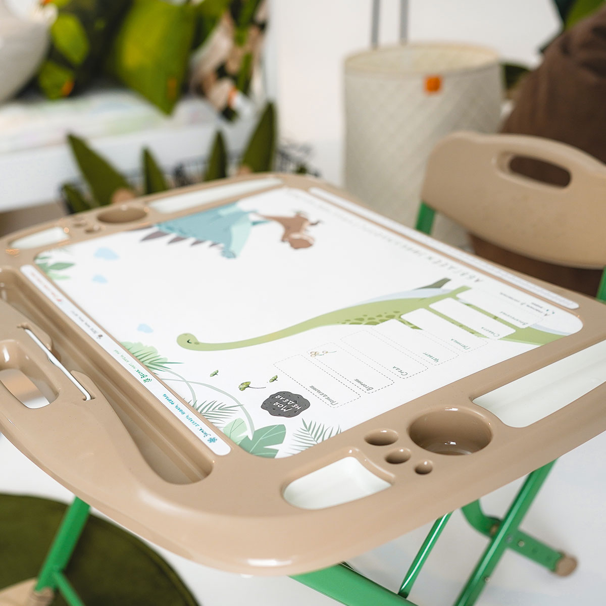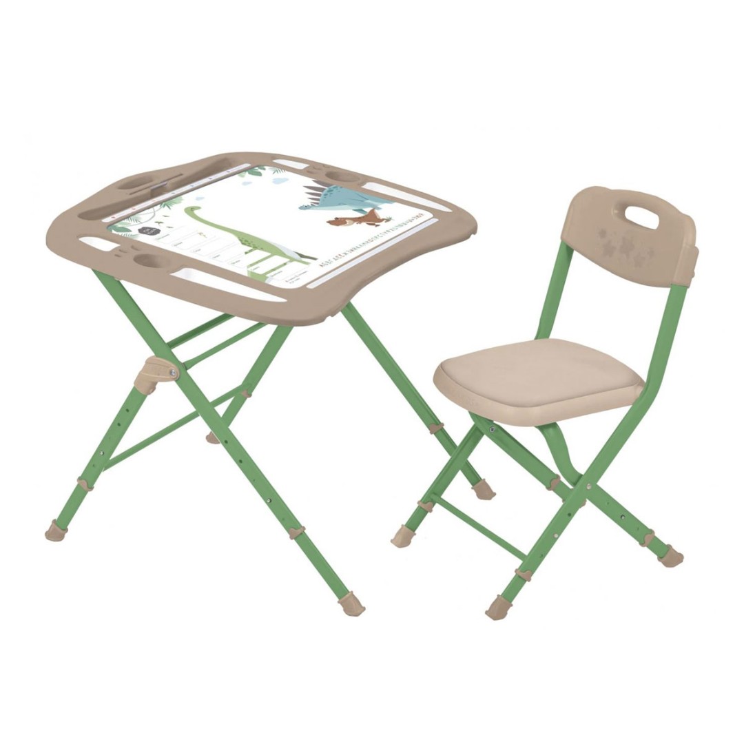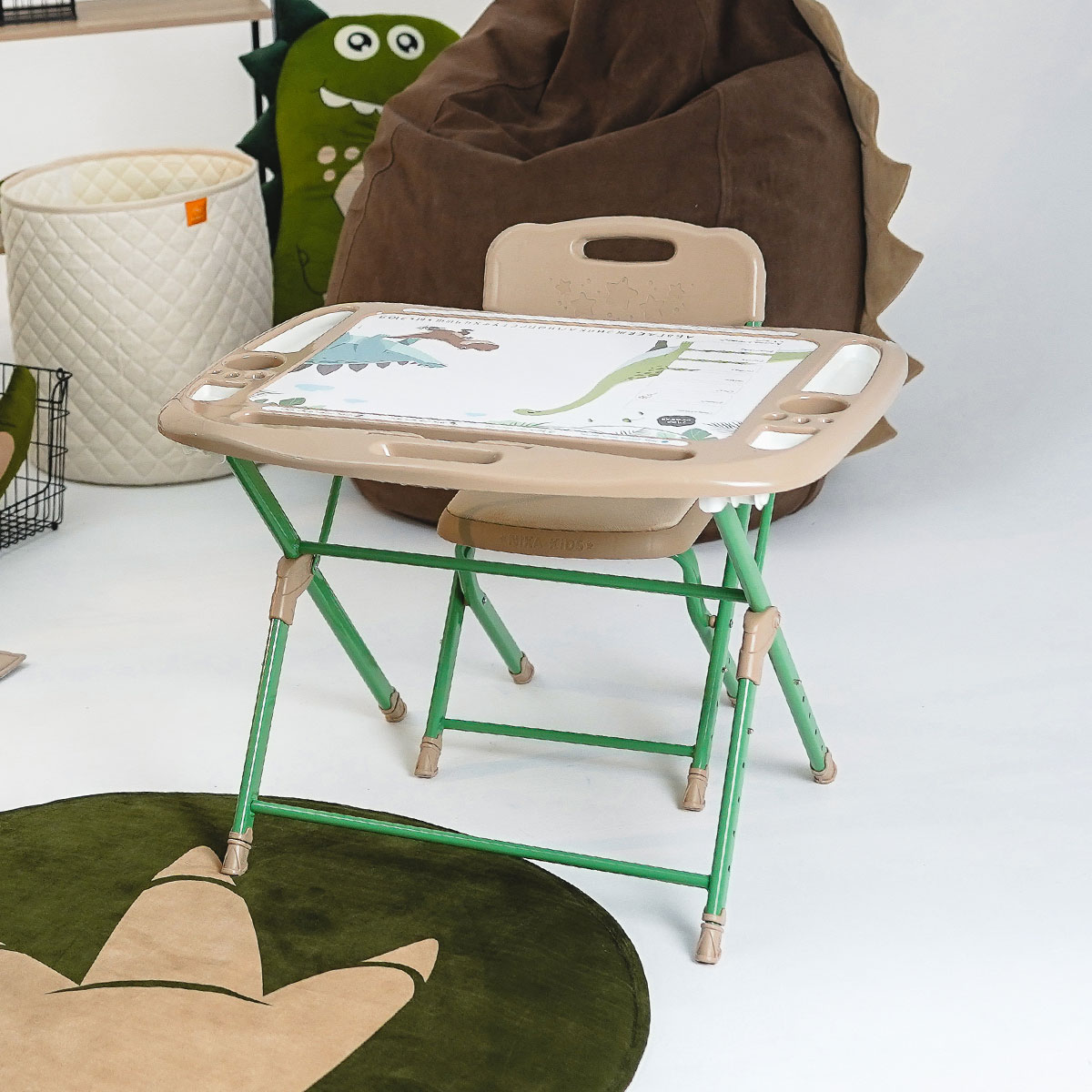 Это обучающий детский комплект мебели, стол и стул, включающий в себя детский столик и стульчик раскладной, с принтом динозавры , представляет собой идеальное решение для маленьких детей. Его минималистичный дизайн легко впишется в любой интерьер и станет прекрасным дополнением детской комнаты, который удобен при чтении, обучения, в саду, для дачи, дома, на балконе. Одно из главных преимуществ этого комплекта детской мебели – его универсальность, можно поменять высоту ножек за счёт удобной регулировки и фиксаторов. Стол и стул станут отличным подарком, как на первый день рождения, так и на годик, Новый год рождество, 23 февраля, 8 марта.