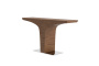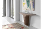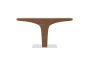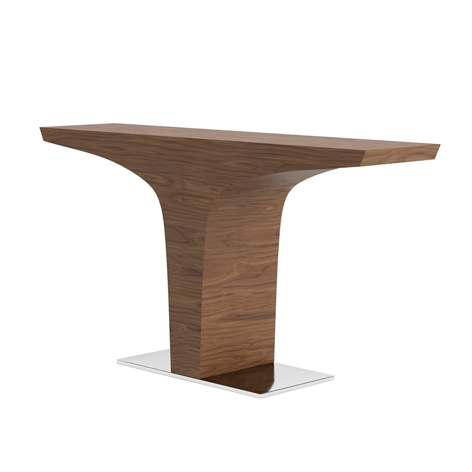 Консоль имеет т-образную форму. Это цельновырезное изделие, не имеющее крепежа и отдельных элементов, кроме металлической подставки снизу. Столешница плавно «перетекает» в опору, зауженной к низу.