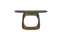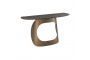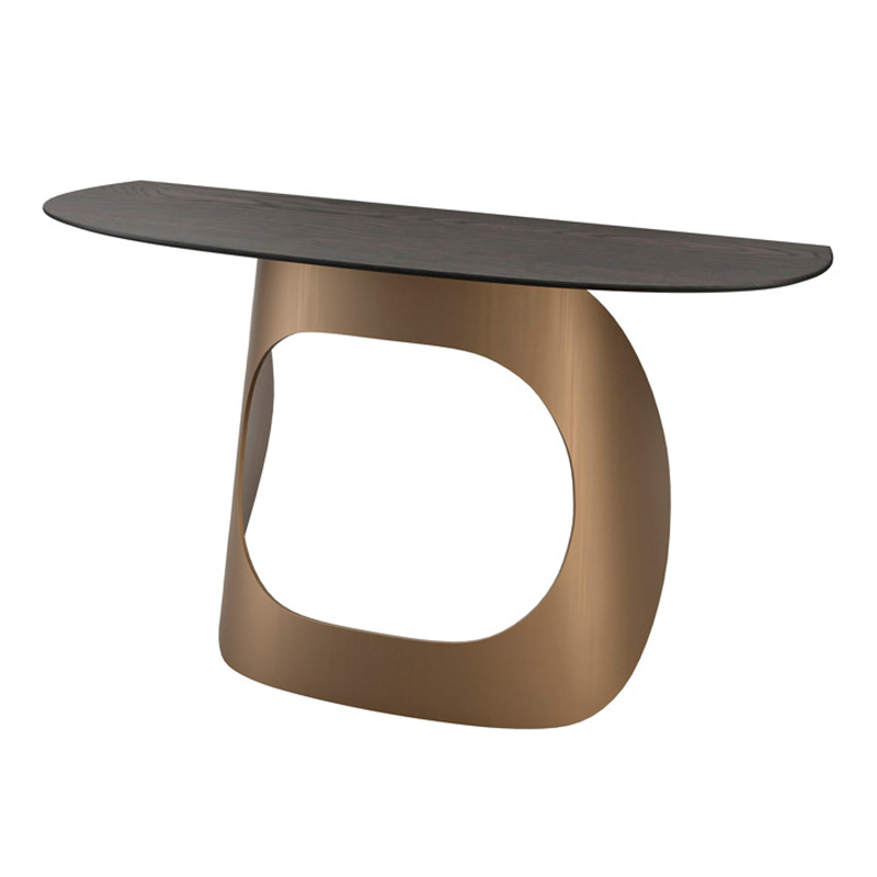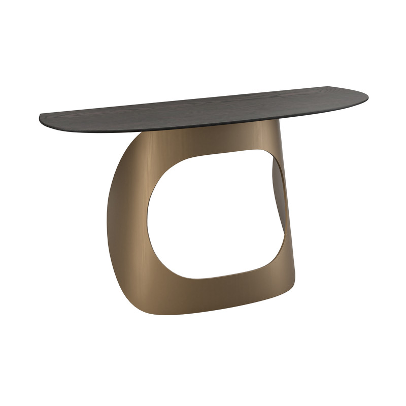 Основание консоли металлическое в цвете матовая латунь, столешница выполнена из высококачественного МДФ в отделке матовый шпон вяза.