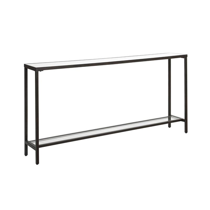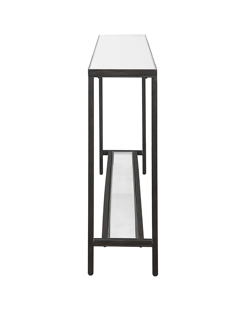 Запросить индивидуальное предложениеКлассическая, минималистичная консоль черного цвета. Зеркальная столешница широкая и имеет много пространства, прочный дизайн каркаса выполнен из железа, нижняя полка из прозрачного закалённого стекла. Консоль придаст дизайнерский вид любой прихожей или гостиной.