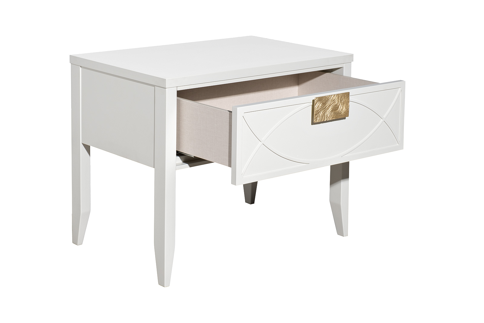 Запросить индивидуальное предложениеДизайнерская тумбочка в стиле ар-деко - авторская разработка студии Garda Decor. Бежевый матовый фасад украшен объемным дугообразным декором и широкими рельефными ручками золотого цвета (матовое золото). Выдвижной ящик прекрасно подойдет для домашней аптечки, хранения белья, щеток, косметики и прочих мелочей. На просторной столешнице будет прекрасно выглядеть одна из настольных ламп в стилистике ар-деко, ассортимент которых широко представлен на нашем сайте. Тонкие ножки придают конструкции легкость и изящество. Эксклюзивная тумбочка станет гармоничным дополнением интерьера спальни, гостиной или прихожей. На фото на сайте тумба прикроватная с 1-м ящиком представлена в комплектации с двумя видами шкафов-витрин: арт.151SV-000017(шкаф-витрина открытый узкий), арт.151SV-000015(шкаф-витрина с 1-м стеклянным фасадом). Тумба прикроватная и витрины скрепляются между собой саморезами(в комплекте).