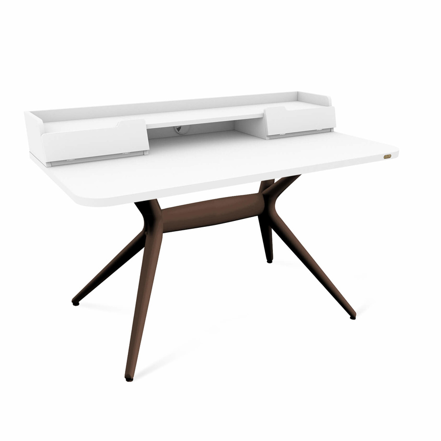 Сдержанный стиль столешницы идеально сочетается с мебелью в современном стиле. На рабочей поверхности расположены два вместительных выдвижных ящика высотой 165 мм и шириной 318 мм для хранения разных вещей. Удобная ниша между ящиками на столешнице подходит для ноутбука. Столешница оборудована системой кабель-менеджмента. В заднем бортике имеется отверстие для проводов, что позволяет удобно расположить зарядку для ноутбука или технические кабели компьютера.