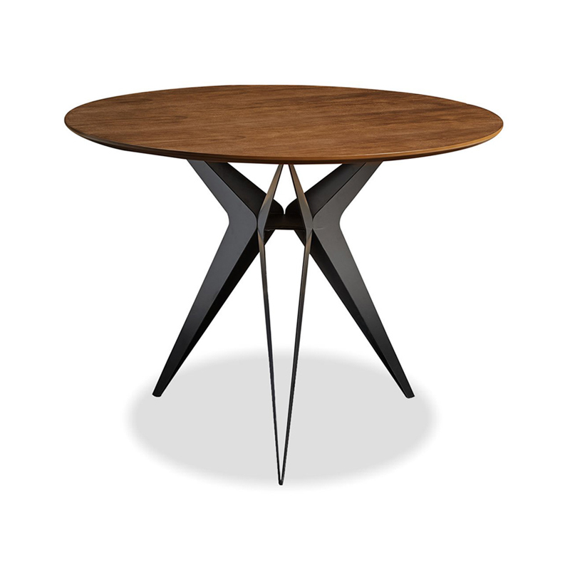 Столешница диаметром 100 см изготовлена из MDF толщиной 4 см и декорирована натуральным шпоном ореха, ножки из стали матово-черного цвета.