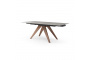 Прямоугольная столешница, ширина которой составляет 90 см, а длина 140 см в базовом состоянии, изготовлена из 12-миллиметровой керамики. Рама сделана из металла, покрытого защитным напылением, а устойчивые ножки – из дерева с ореховым шпоном. Длину столешницы можно увеличить на 60 см (до 200 см), поэтому данную модель удобно использовать и для повседневных трапез, и для приема гостей.