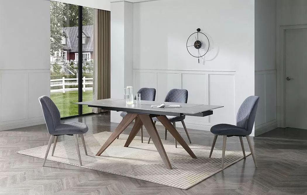 Раскладной стол Valencia (Валенсия) с серой керамической столешницей и ножками орехового оттенка выглядит очень красиво и стильно. Он подойдет для кухни или столовой, оформленной в любом стиле, а особенно таких, как лофт, современный и им подобных