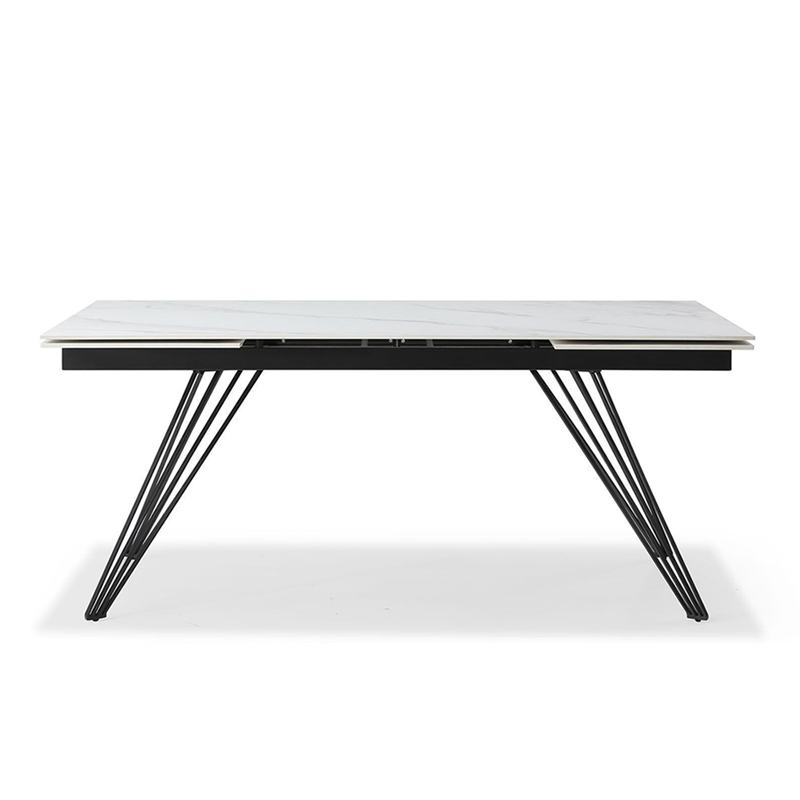 Раскладной стол Parma (Парма) с прямоугольной керамической столешницей с текстурой, стилизованной под каррарский мрамор, и металлическими черными ножками, состоящими из множества тонких прутиков, - отличный выбор для кухни или столовой, гостиной. Особенно удачно он будет смотреться в таких стилях, как хай-тек, минимализм и пр.