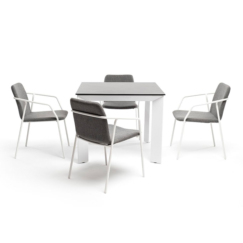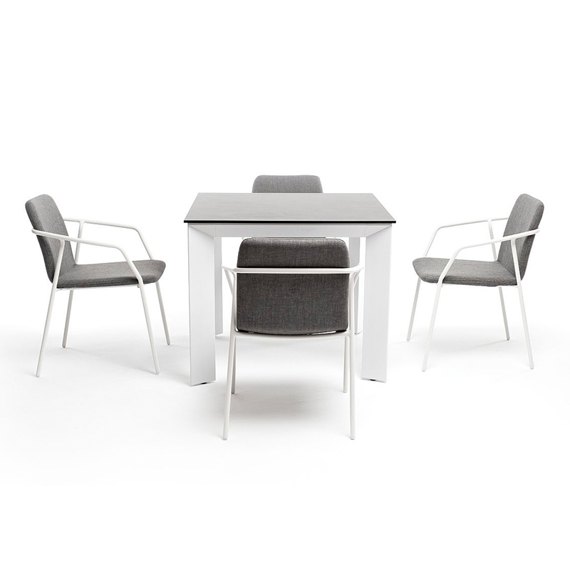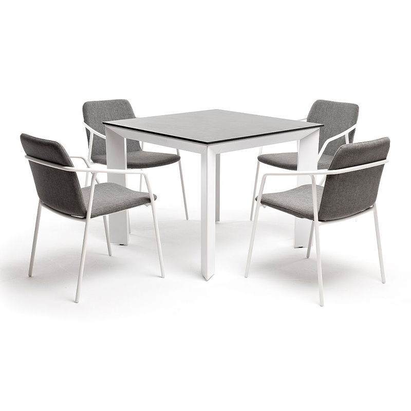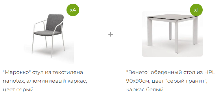 - 4 стула "Марокко" из текстилена nanotex, современного материала для обивки мебели, размером - 575х600х800 мм, каркас белого цвета изготовлен из алюминия, что делает стул прочным и легким. "Венето" обеденный стол из HPL 90х90см, цвет "серый гранит", каркас белый 1шт. 900Х900Х750, "Марокко" стул из текстилена nanotex, алюминиевый каркас, цвет серый 4шт. 575Х600Х800,