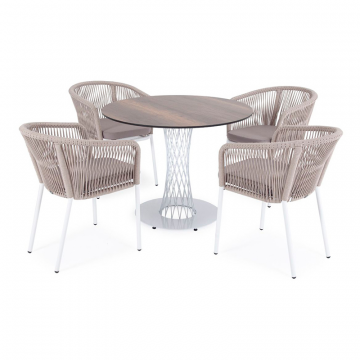 Возможно изготовление стола любого размера и формы по индивидуальному заказу. "Диего" обеденный стол из HPL круглый Ø100см, цвет "дуб", каркас черный 1шт. 1 000Х1 000Х750, "Марсель" стул плетеный из роупа, каркас алюминий белый шагрень, роуп бежевый круглый, ткань бежевая 4шт. 570Х620Х800,