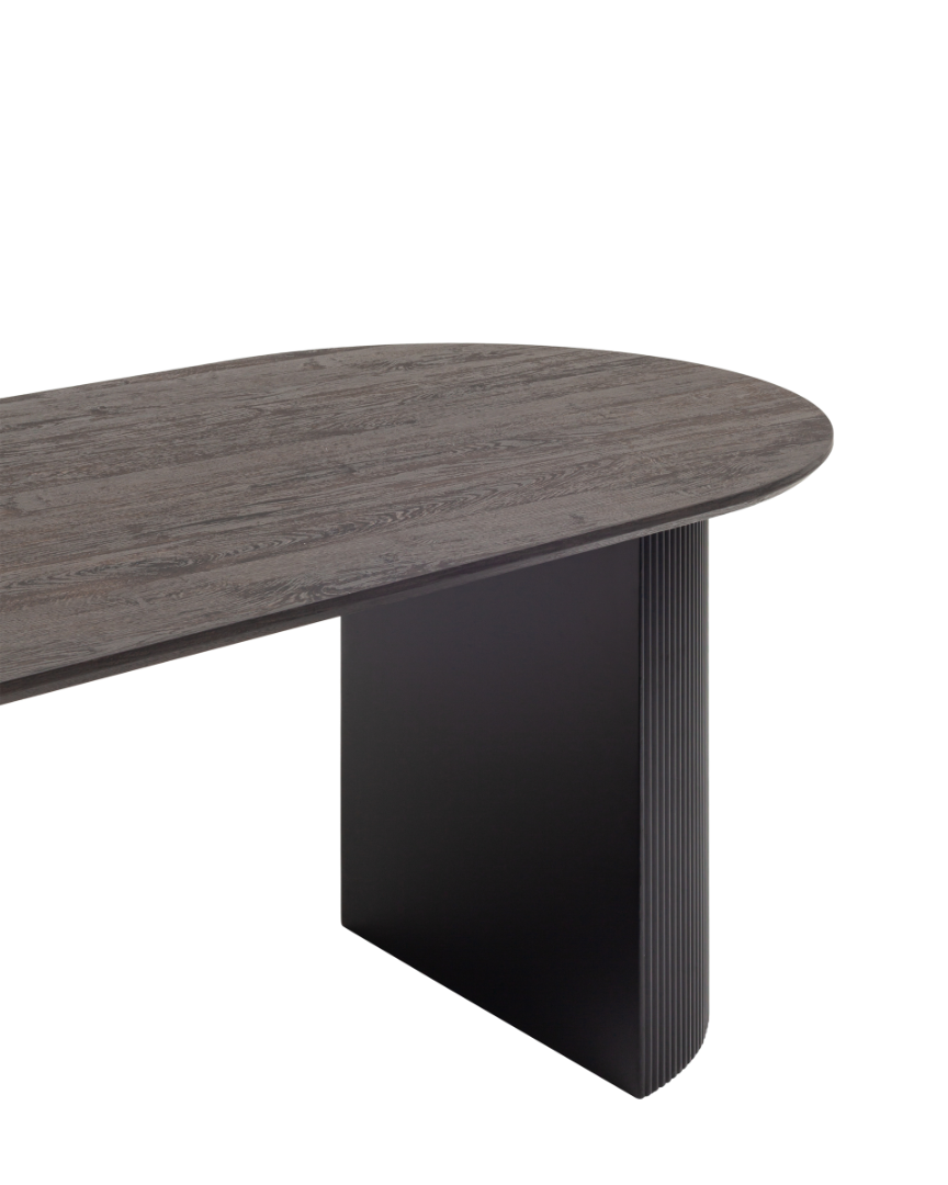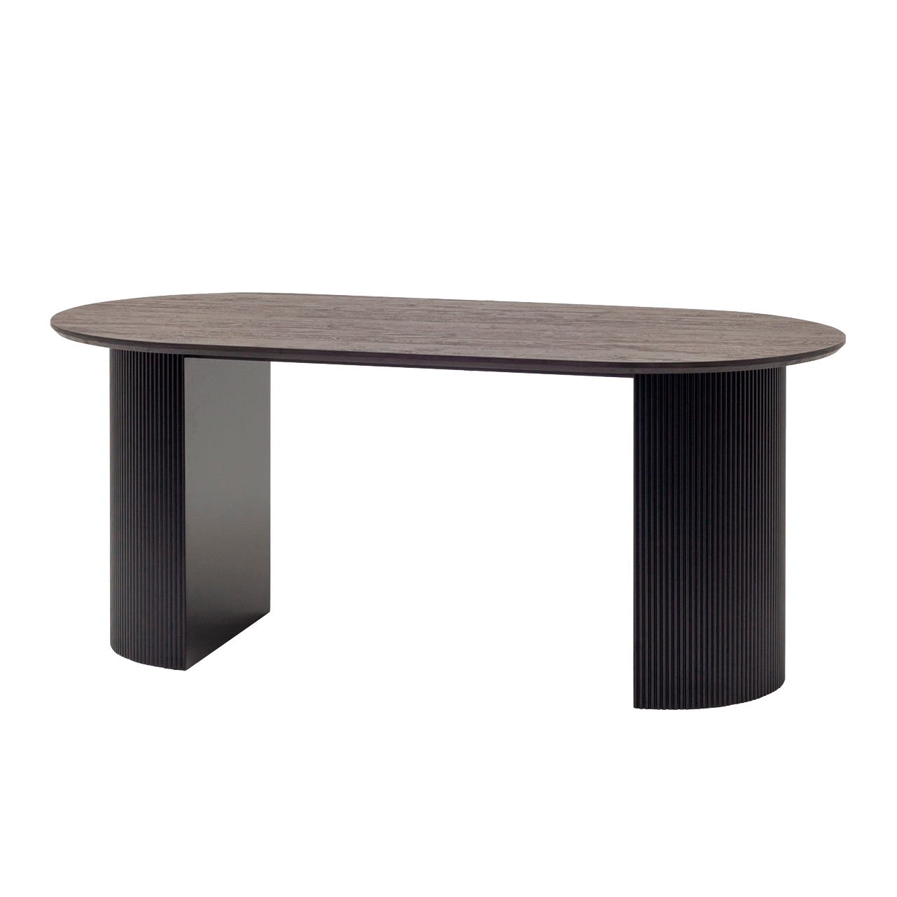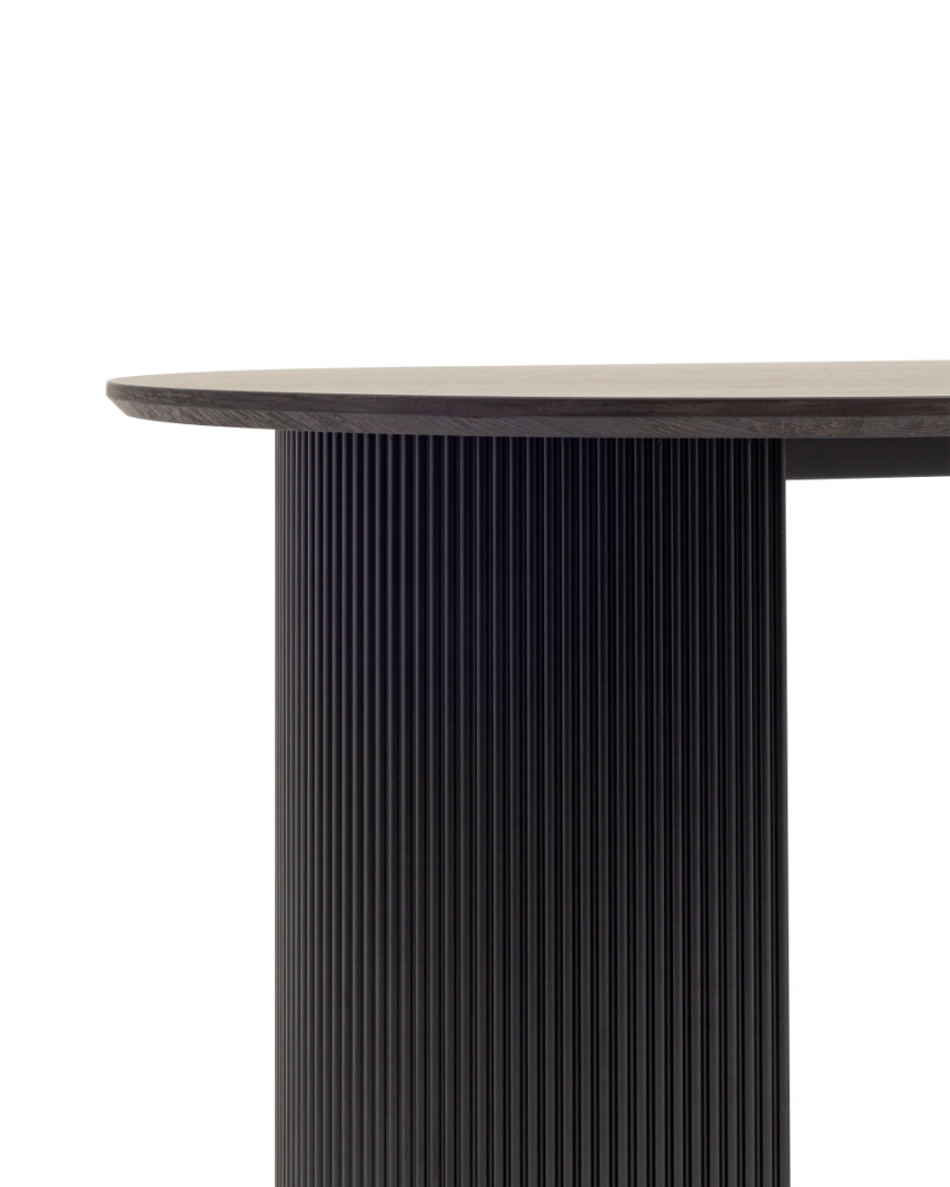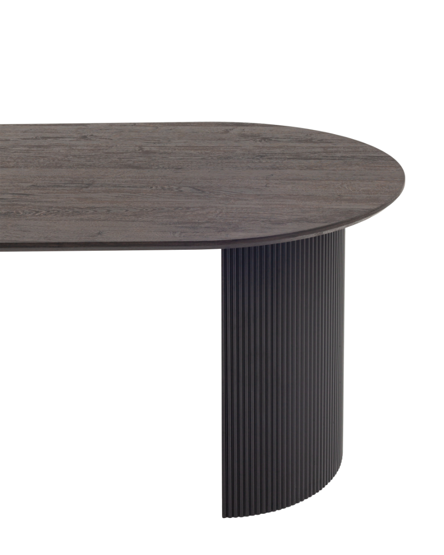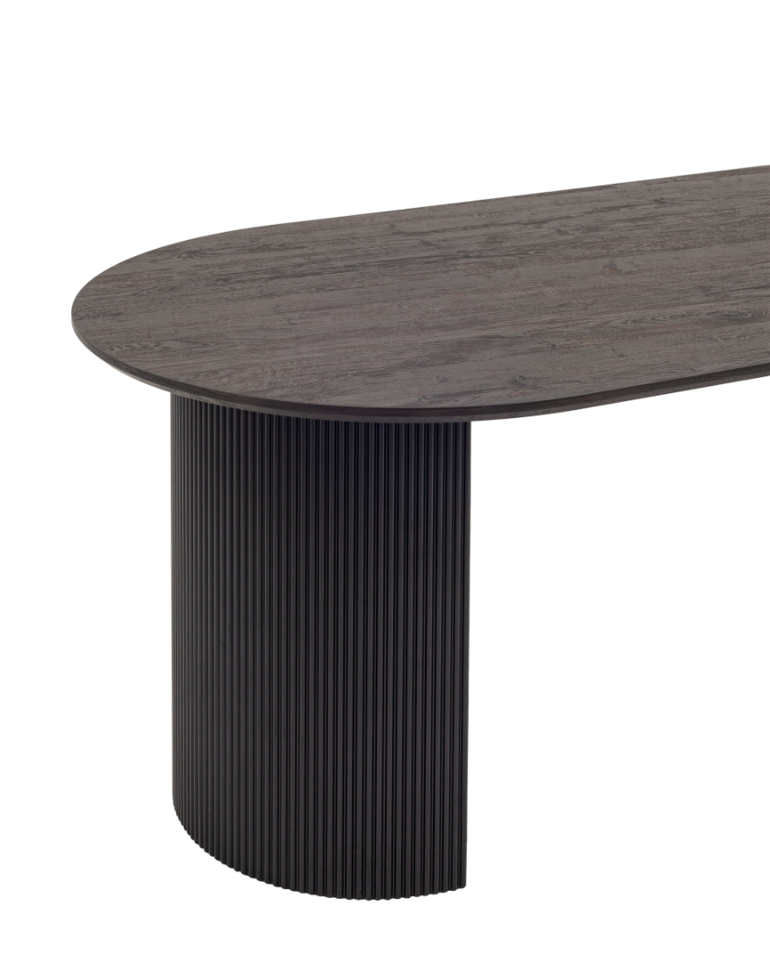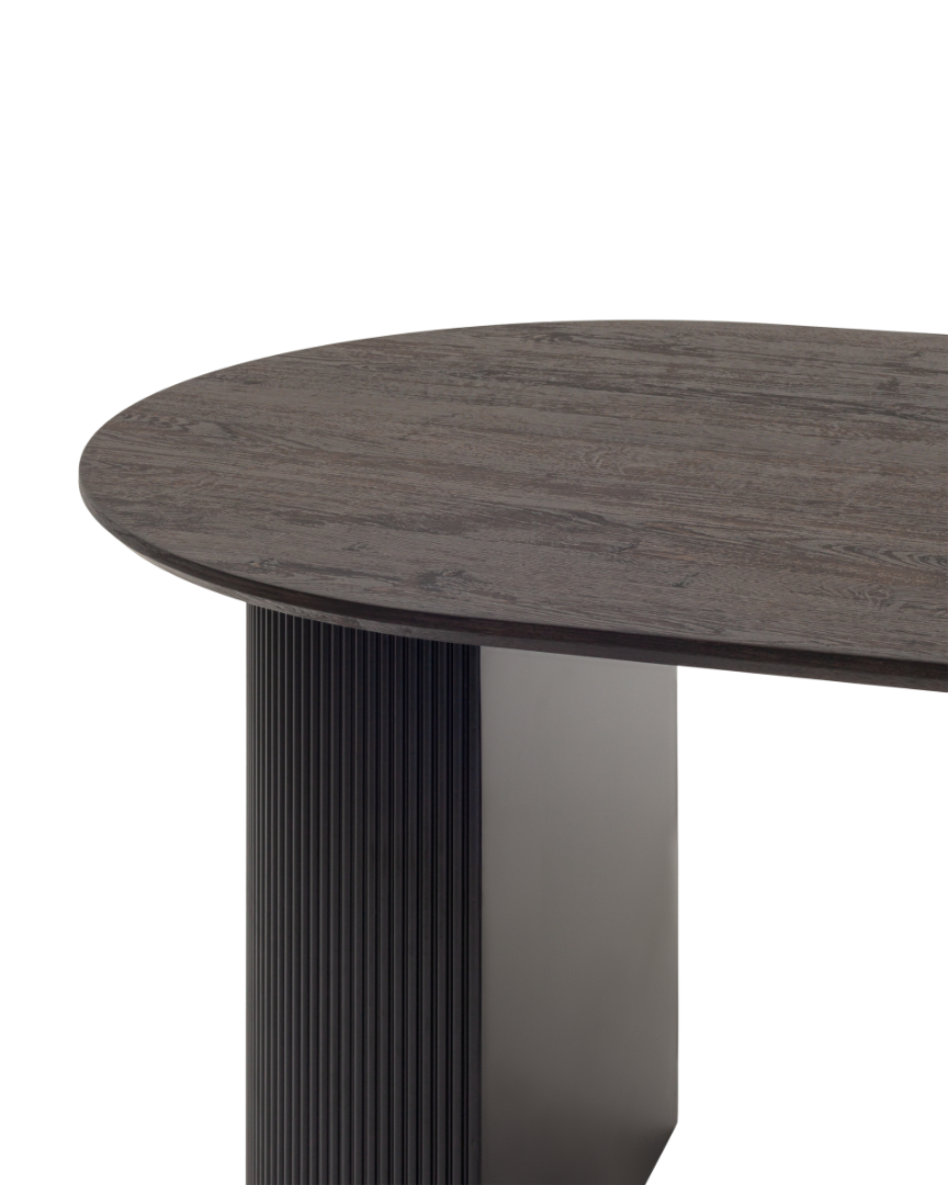 Запросить индивидуальное предложениеОбеденный стол Ballet. Столешница выполнена из прочного и долговечного МДФ. Темная поверхность столешницы гармонично сочетается с массивными ножками черного цвета. Простая овальная форма стола позволит легко вписать его в современный интерьер, стол украсит кухню, гостиную или современное кафе, ресторан. Опорные плиссированные ножки в лаконичном дизайне надёжно удерживают всю конструкцию и дополняют монолитный образ. Вес стола - 58 кг, высота - 75 см.