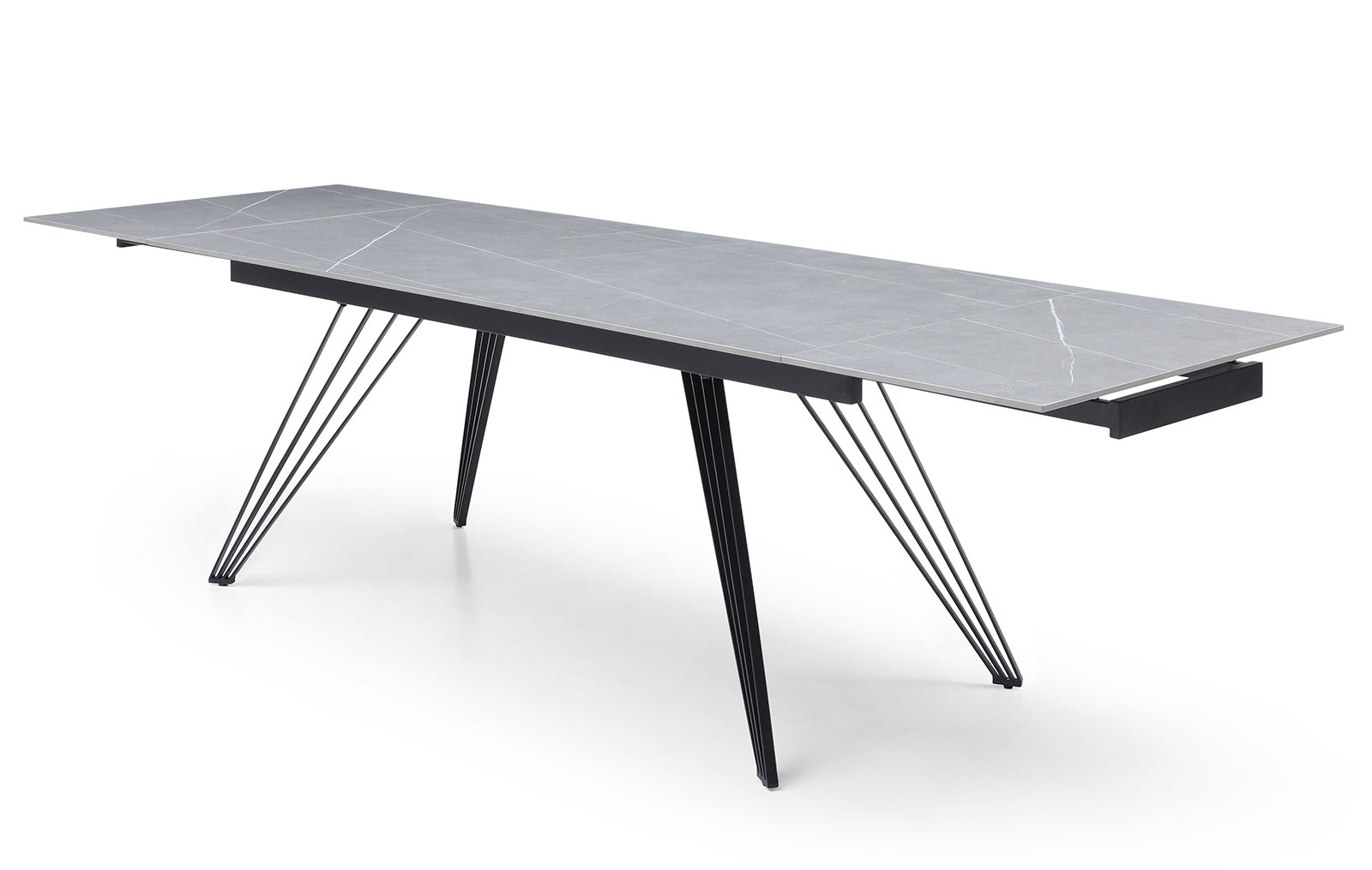 Раскладной обеденный стол Parma (Парма) с практичной керамической столешницей из матовой серой керамики и металлическими ножками, состоящими из множества тонких прутиков, с защитным напылением - отличный выбор для украшения кухни, столовой, гостиной. Особенно удачно сочетание керамики и металла будет смотреться в таких стилях, как хай-тек, минимализм, лофт, фьюжн.