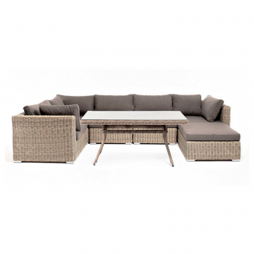 Облегченный алюминиевый каркас, вручную оплетенный долговечным искусственным ротангом натурального соломенного оттенка. Обеденный стол с прочной стеклянной столешницей толщиной 5 мм.