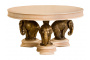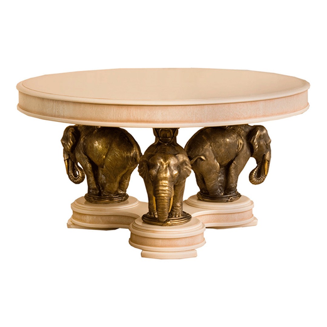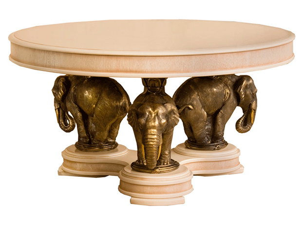 Запросить индивидуальное предложениеТри величественных слона являются опорой для столешницы из плитного материала МДФ, который изготавливается путём спрессовывания древесной крошки под высоким давлением, благодаря чему изделие очень прочное и лёгкое. Поверхность шпонирована натуральным деревом дуба, тонирована и покрыта лаком. Из этого же материала сделан пьедестал, на котором расположены скульптуры.Число три всегда имело магическое значение для многих народов мира. Это – знак триединства, загадочный и приносящий удачу символ. Сами скульптуры отлиты вручную из мрамора высокого качества и окрашены в технике патинирование.В известной легенде о плоской земле три могучих слона удерживают на своих спинах весь мир, их сильные ноги веками служат опорой для нашей планеты: данный миф послужил идеей для дизайна стола «Элефант». Эти прекрасные животные ассоциируются с благоразумием, спокойствием, достоинством, добротой и богатством. Слон – также символ удачи, поэтому в доме каждого человека должна быть статуэтка в виде этого благородного зверя. Тот, кто любит слонов и держит дома фигурки этих животных, обладает твёрдым характером, развитым интеллектом, миролюбием и терпением.Царский обед или деловые переговоры, которые обязательно будут иметь выгодный исход, – этот стол уместен в любой ситуации.