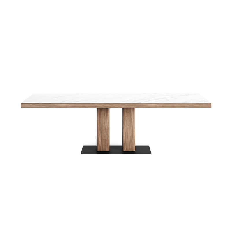 Запросить индивидуальное предложениеСтолы серии ТВИКС обладают хорошей устойчивостью и универсальным дизайном, что делает их подходящими как для ресторанов и кафе, так и для дома. Стол имеет прочную опору и царгу из массива дуба со сложными скругленными углами. Для увеличения устойчивости стола используется стальной фланец, который может быть покрыт порошковой краской или быть выполнен из нержавеющей стали. Столешница выполнена из тонкой плиты керамогранита. Разнообразие цветовых решений достигается возможностью комбинировать варианты тонирования деревянных деталей и отделки самой столешницы. На выбор покупателей имеется два варианта стола: с одной или двумя прямоугольными опорами.