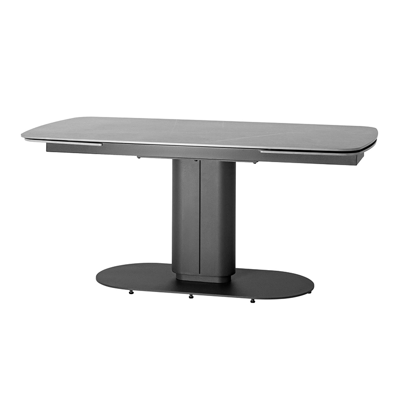 Столешница сделана из керамики - устойчивый, прочный и экологичный материал. Закруглённые углы и матовая поверхность придают лёгкость и лаконичный образ. По бокам стола расположены дополнительные раздвижные элементы, которые увеличивают полезную площадь столешницы на 40 или 80 см в длину. Монолитная ножка имеет обтекающие формы и закруглённые углы, повторяя мотив всей конструкции. Основание оснащено защитными заглушками, которые не позволяют металлическим частям соприкасаться с полом и портить покрытие при перемещении.