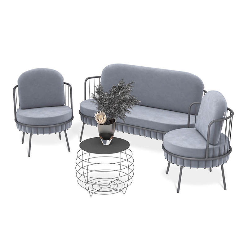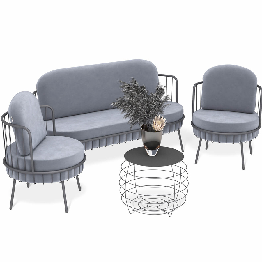 Каркас кресла и дивана выполнены из металла и окрашены порошковой краской, устойчивой к механическому воздействию. Наполнитель – высокоэластичный ППУ, не теряющий своих упругих свойств на протяжении долгих лет. Обивка из микровелюра отличается практичностью и простотой эксплуатации.