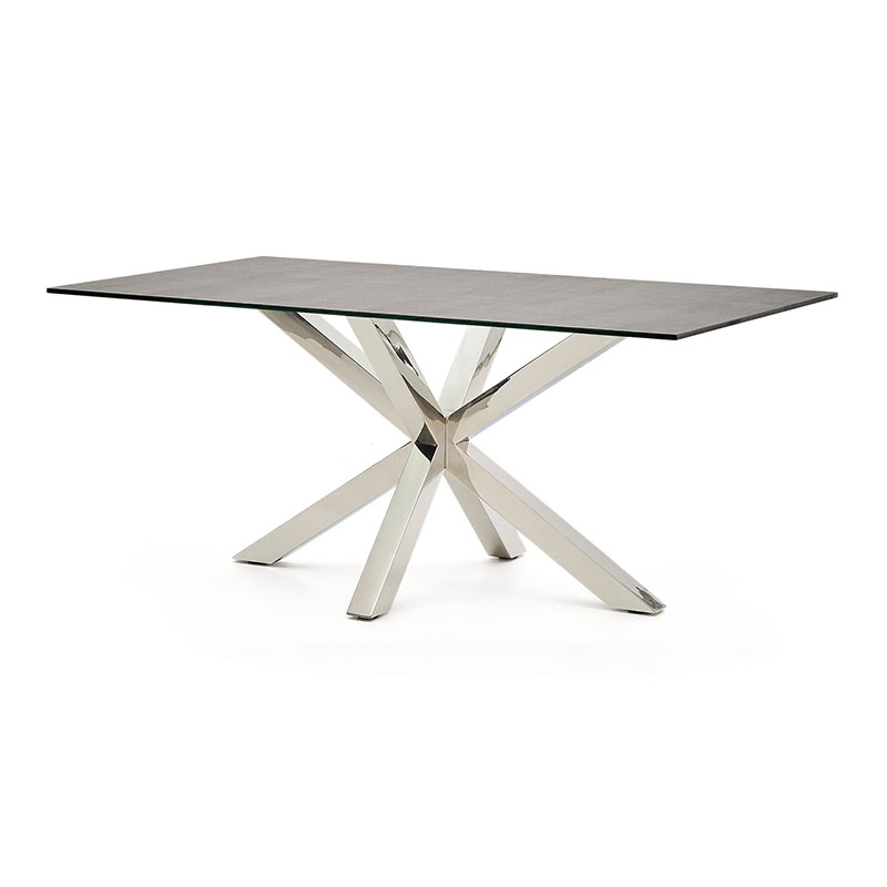 Обеденный стол со столешницей из высокотехнологичного фарфора со стеклянной опорой. Отделка «Железный мох». Ножки из нержавеющей стали.