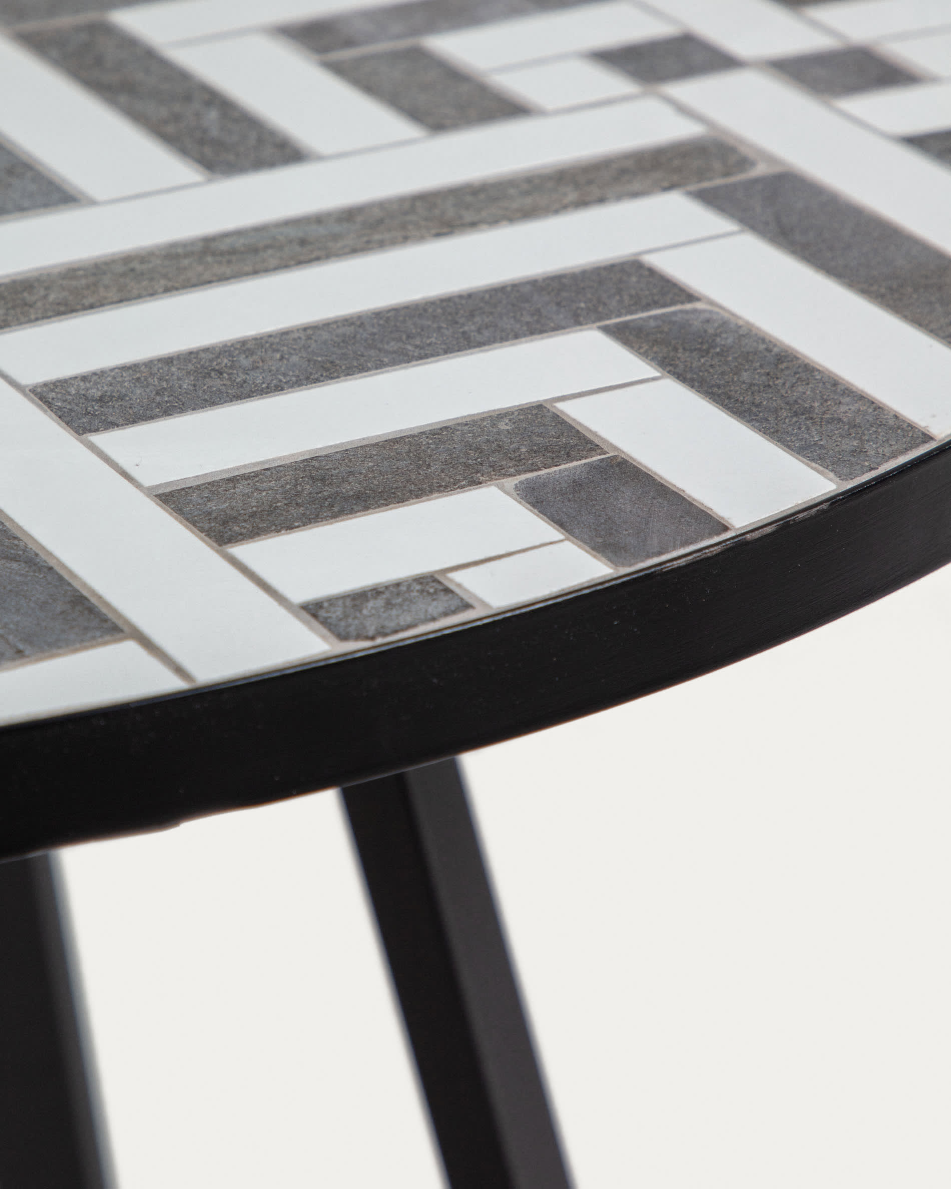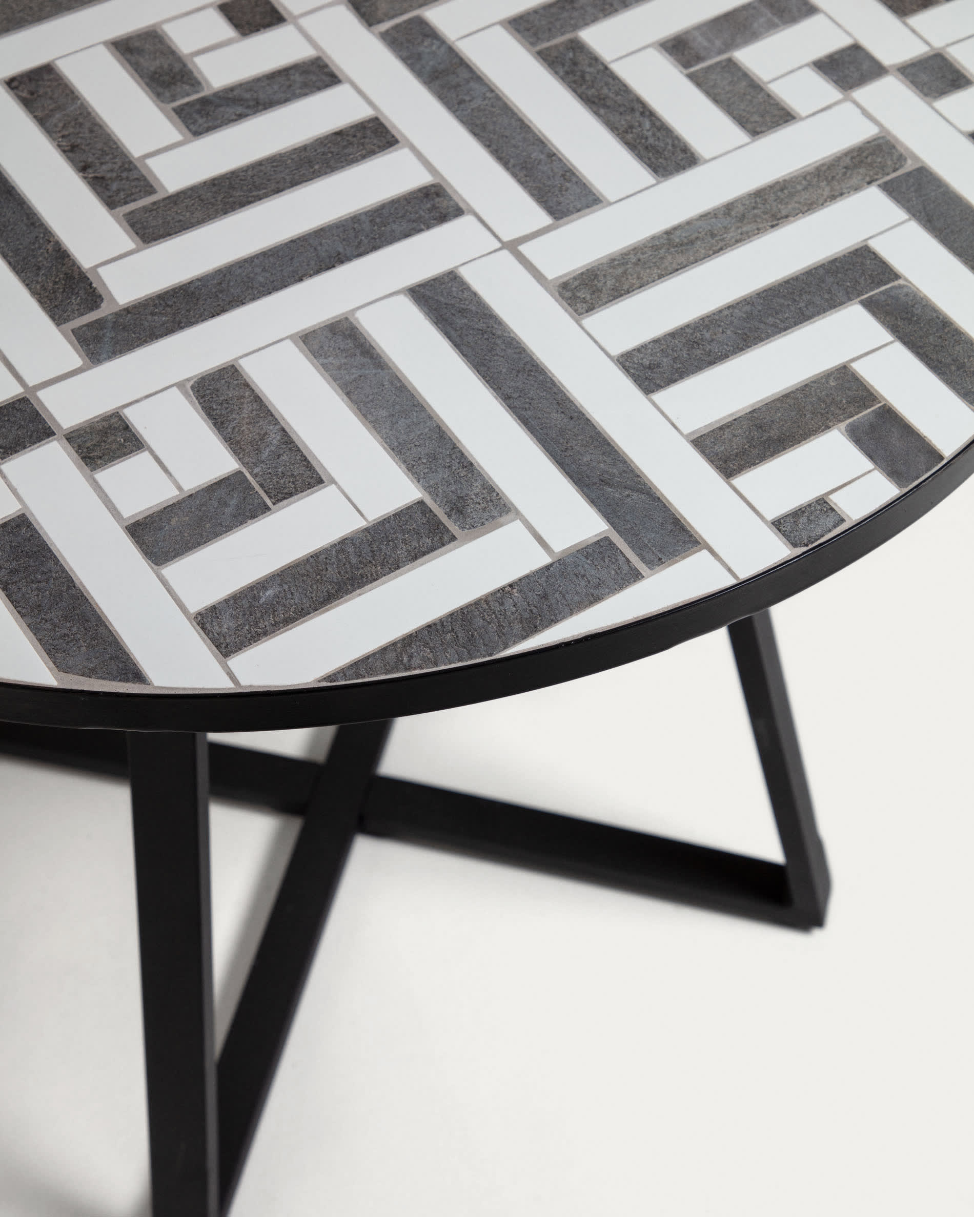 Запросить индивидуальное предложениеСтолешница Tella изготовлена из черно-белой плитки, создавая мозаику из геометрических фигур. Каждая часть была размещена вручную, что делает каждый стол эксклюзивным и неповторимым. Его конструкция из четырех блокирующих ножек изготовлена из оцинкованной стали, устойчивой к ржавчине, коррозии и ультрафиолетовому излучению, поэтому вы можете использовать ее на открытом воздухе под навесом. Цвета отделки указываются в соответствии с каталогом производителя. Допускается незначительное отклонение в цвете, обусловленное техническими особенностями цветопередачи фотографий.