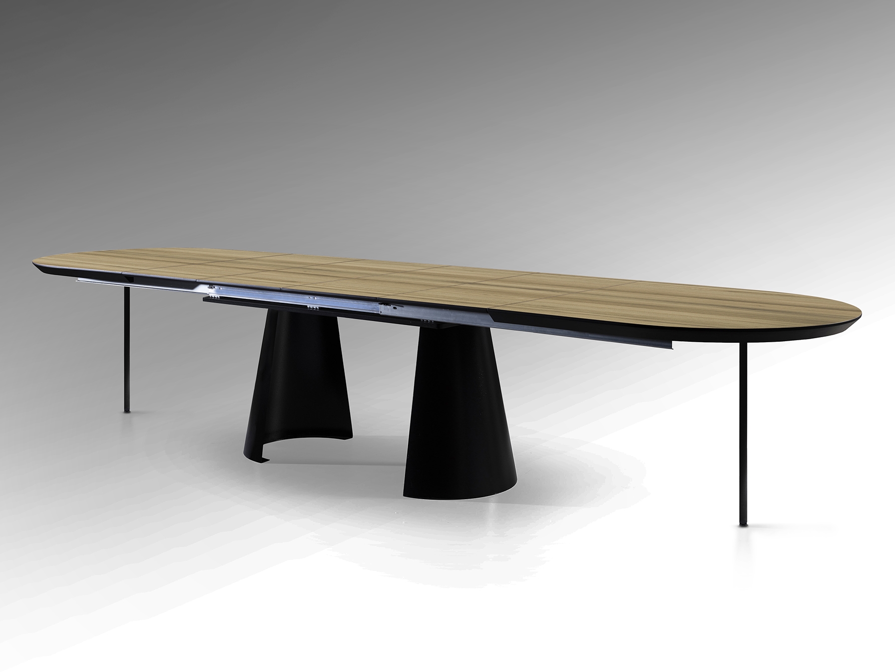 Запросить индивидуальное предложениеРаздвижной обеденный стол из металла с черной матовой отделкой и столешницей из МДФ с высокостойкой меламиновой поверхностью, отделкой под дерево, с черными матовыми краями. Удлиняется до 4 метров. В комплект входят 2 дополнительные ножки, исключающие легкую вибрацию верхней части при полном выдвижении. Цвета отделки указываются в соответствии с каталогом производителя. Допускается незначительное отклонение в цвете, обусловленное техническими особенностями цветопередачи фотографий.