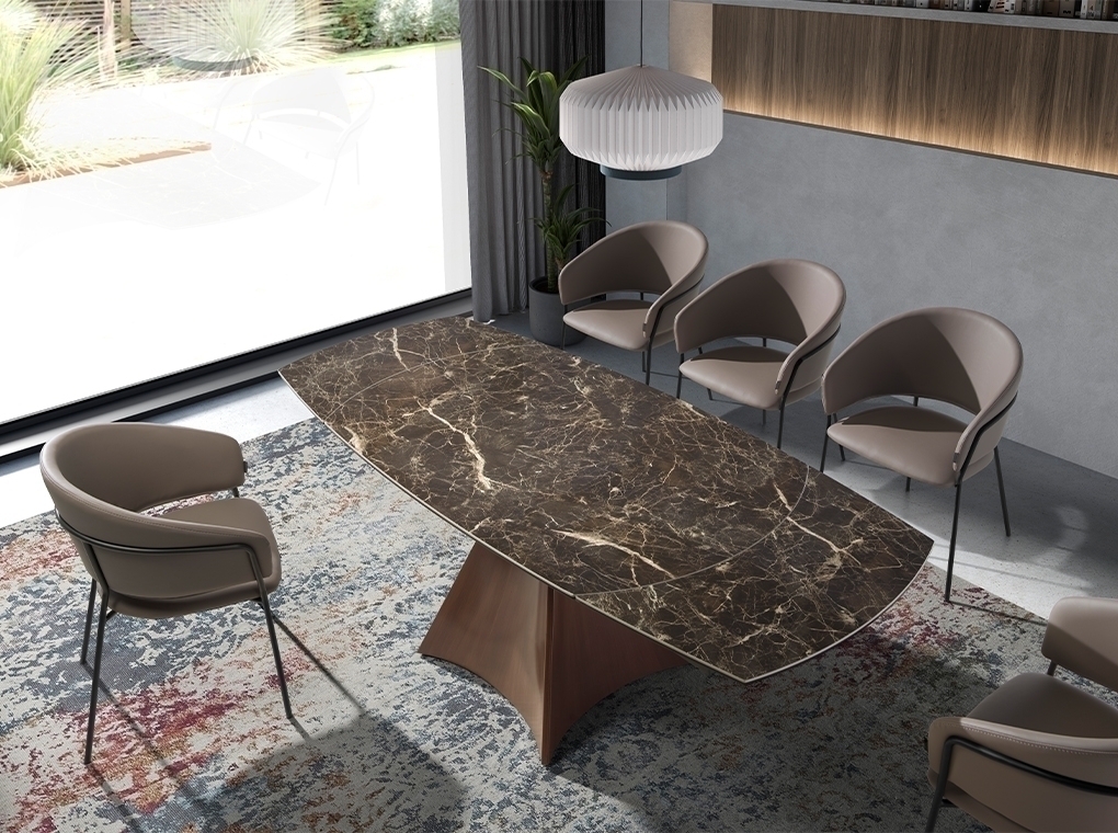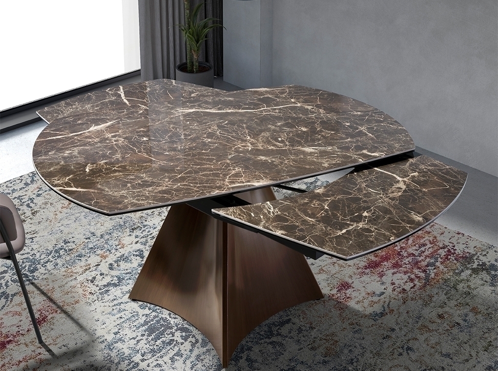 Запросить индивидуальное предложениеРаздвижной стол 1113/MC22181DT от фабрики Angel Cerda – овальная мраморная столешница и оригинальная стойка. Раздвижной обеденный стол 1113/MC22181DT добавит вашей столовой стиль и индивидуальность. Деревянная стойка и коричневый мрамор – идеальный тандем, который сумеет преобразить каждую вашу сервировку. Его раздвижная конструкция позволит разместить больше гостей. Поэтому этот персонаж будет всегда главным в момент ваших застолий! Стол овальной формы, имеет сборную конструкцию. Столешница изготовлена из керамогранита коричневого цвета. Сверху нанесен глянцевый слой защиты от мелких порезов, сколов. Стойка изготовлена из дерева и покрыта шпоном натурального ореха. Тон и рисунок древесины на каждом изделии уникальны. Снизу установлены накладки, которые защищают древесину от повреждений и улучшают устойчивость. Чтобы увеличить площадь столешницы, необходимо раздвинуть края в противоположные стороны и извлечь дополнительную секцию. Цвета отделки указываются в соответствии с каталогом производителя. Допускается незначительное отклонение в цвете, обусловленное техническими особенностями цветопередачи фотографий.