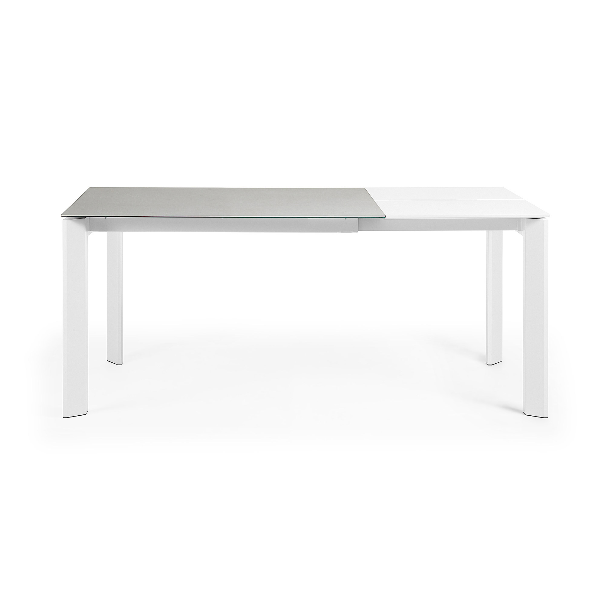 Выдвижной механизм находится справа. Чтобы раздвинуть стол, необходимо потянуть за ножки и достать сложенную пополам дополнительную панель (она также из керамики). Раздвижной механизм сделан из нержавеющей стали.