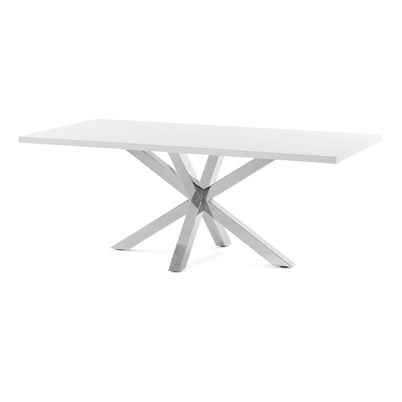 Стол Arya сталь матовый, белый от фабрики La Forma – идеальная концепция для интерьера в стиле хай-тек. Стол выглядит современно, лаконично, эффектно. Его нестандартная конструкция первой привлекает внимание. Но это не единственная особенность модели. Белоснежная столешница – еще один элемент, который задерживает на себе взгляд. Изделие однозначно украсит современную гостиную, сделает ее более модной. Особенно, если оно окажется в интерьере хай-тек или фьюжн. Стол состоит из прямоугольной столешницы и восьмиконечной опоры. Столешница сделана из МДФ, покрытого белой глянцевой краской. Эмаль износостойкая, хорошо очищается от загрязнений (не допускается чистить поверхность абразивами). Толщина столешницы составляет 2,5 см. Опора полностью металлическая, покрыта хромом. Она собрана из четырех одинаковых по размеру угловых ножек с шириной грани 7 см. Ножки поддерживают столешницу и опираются на пол на одинаковом отдалении друг от друга, что обеспечивает устойчивость, прочность, равномерное распределение веса стола. Размеры: длина 160, 180 или 200 см (зависит от выбранной модели), ширина – 100 см, высота – 78 см. В коллекции Arya присутствуют аналогичные модели, выполненные из других комбинаций материалов, цветов. Потребуется сборка.