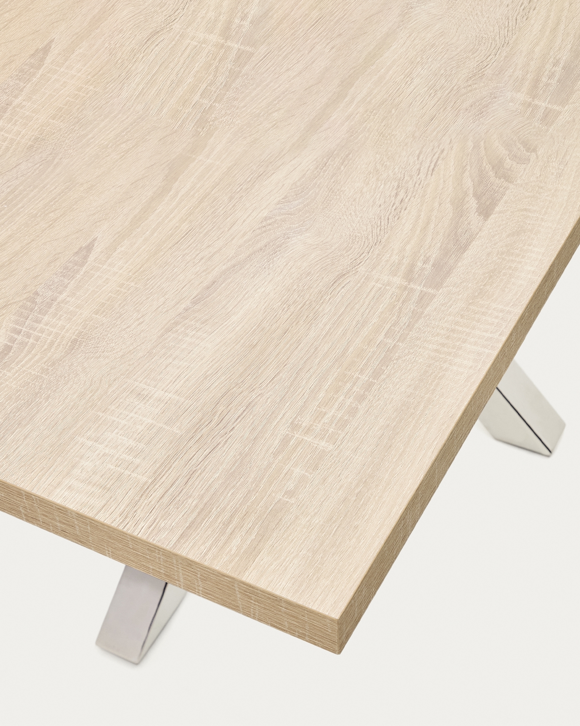 Стол конструкционно состоит из цельной деревянной столешницы и металлической опоры. Столешница – прочная панель из МДФ беленого дуба толщиной 4 см. Она полностью воспроизводит природную красоту дерева – его оттенок, зерна, вершины.