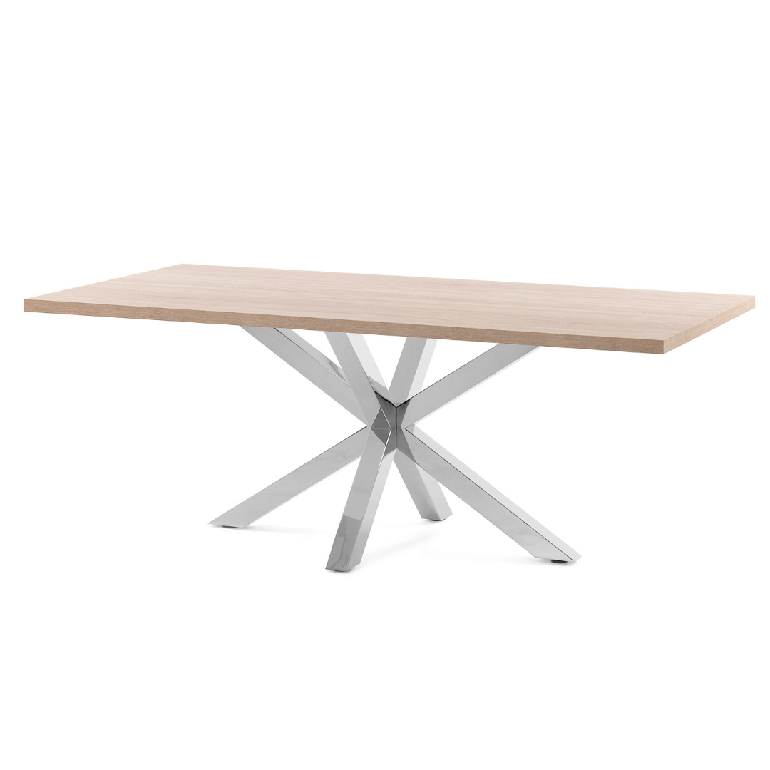 Стол Arya сталь натуральный от фабрики La Forma – эффектная модель для стильных городских интерьеров. Стол Arya сразу убеждает в своем нетрадиционном исполнении. Первое, что привлекает, это эффектная восьмиконечная стойка. Ее зеркальная поверхность выглядит ярко и завораживающе. Второе – это массивная столешница из дерева, которая дает контраст на фоне блеска опоры. Все это делает изделие небанальным и нескучным. Стол конструкционно состоит из цельной деревянной столешницы и металлической опоры. Столешница – прочная панель из МДФ беленого дуба толщиной 4 см. Она полностью воспроизводит природную красоту дерева – его оттенок, зерна, вершины. Опора имеет восьмиконечную конструкцию. Металл с хромовым покрытием, что обеспечивает стойкость к влаге, упрощает чистку. Ножки имеют форму брусков с шириной и длиной грани 7 см. Их симметричное расположение обеспечивает равномерное распределение веса стола, устойчивость при сильных нагрузках. Размеры: длина – 160,180 или 200 см (зависит от выбранной модели), ширина – 100 см, высота – 78 см. Потребуется самостоятельная сборка. В коллекцию Arya входят модели с аналогичным дизайном, но изготовленные из других материалов.