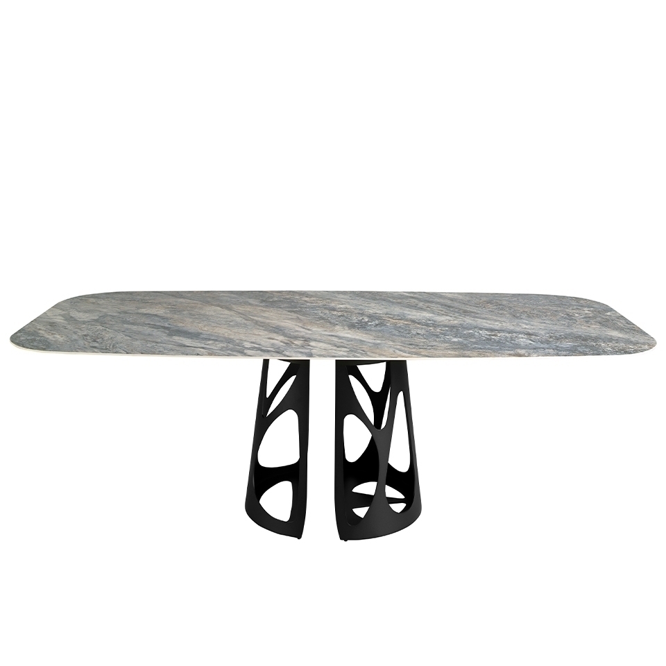 Запросить индивидуальное предложениеСовременный дизайн овальный обеденный стол с фиксированной столешницей из синего фарфорового мрамора с серыми и коричневыми прожилками в глянцевой отделке. Его оригинальные черные ножки из нержавеющей стали, окрашенные в эпоксидную смолу, являются ключевыми элементами его дизайна. Цвета отделки указываются в соответствии с каталогом производителя. Допускается незначительное отклонение в цвете, обусловленное техническими особенностями цветопередачи фотографий.