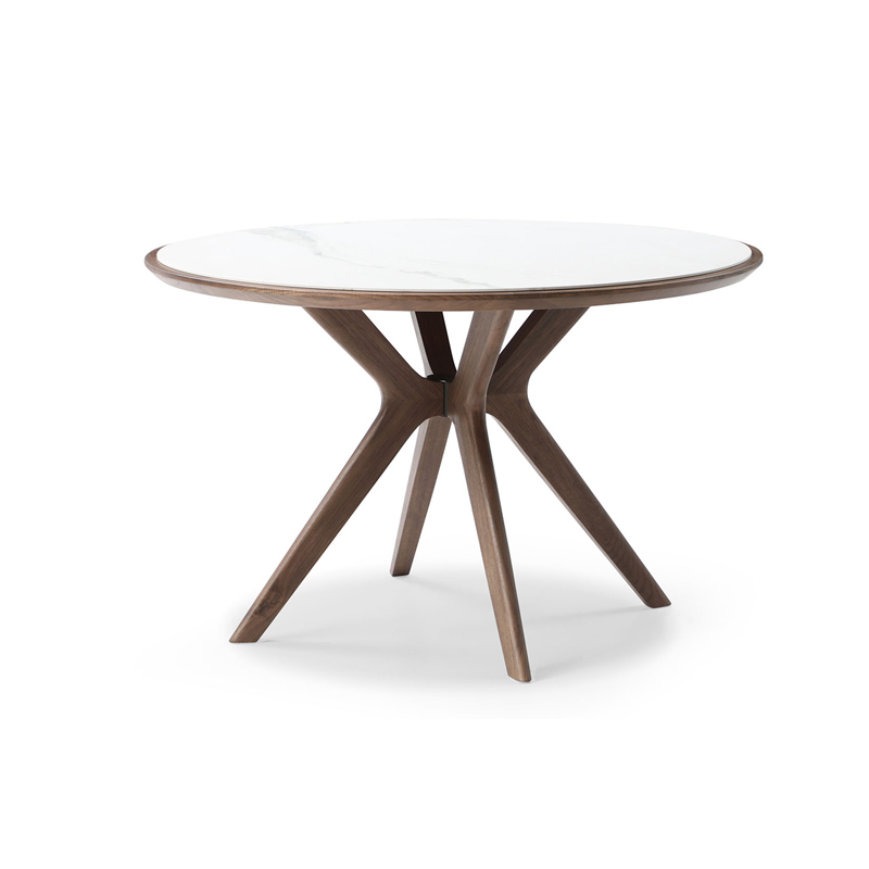 Столешница сделана из MDF с керамическим покрытием и в шпоне ореха по краю. Ножки стола сделаны из натурального дерева в шпоне ореха. Крепления - из нержавеющей стали.