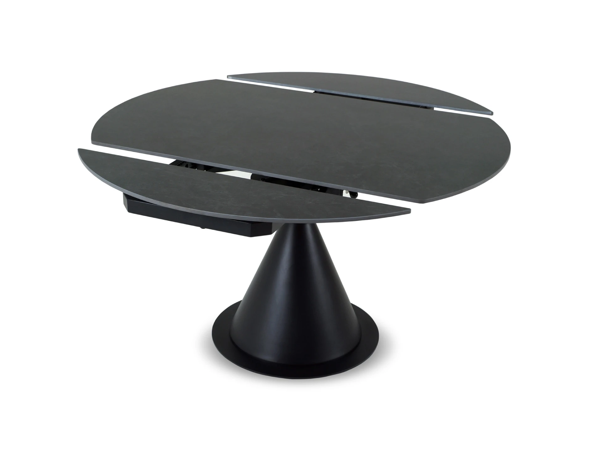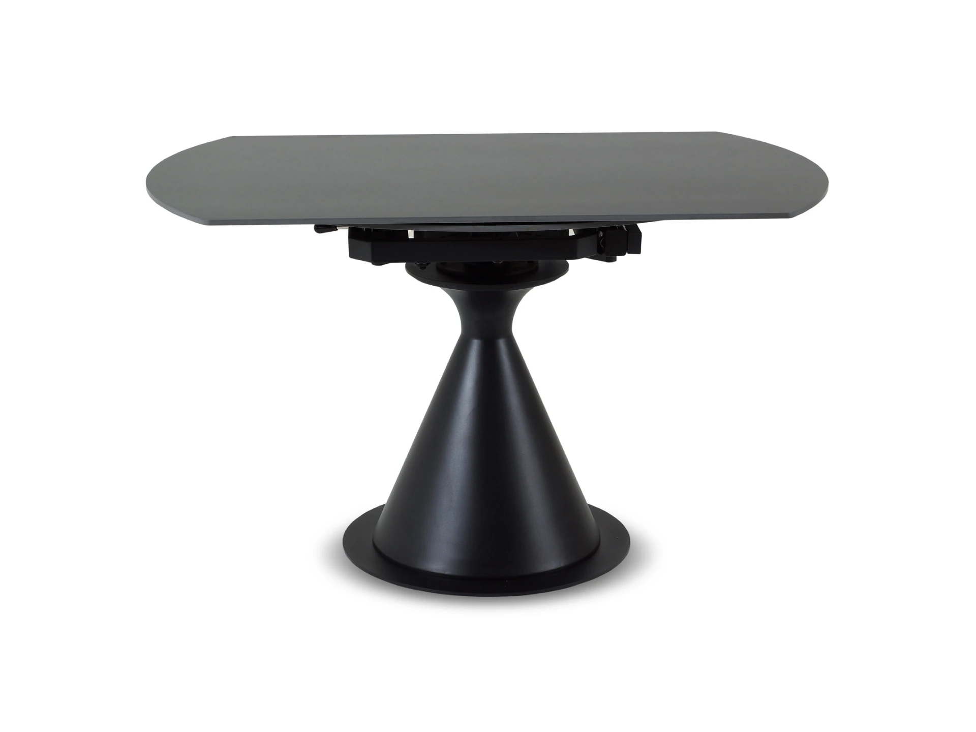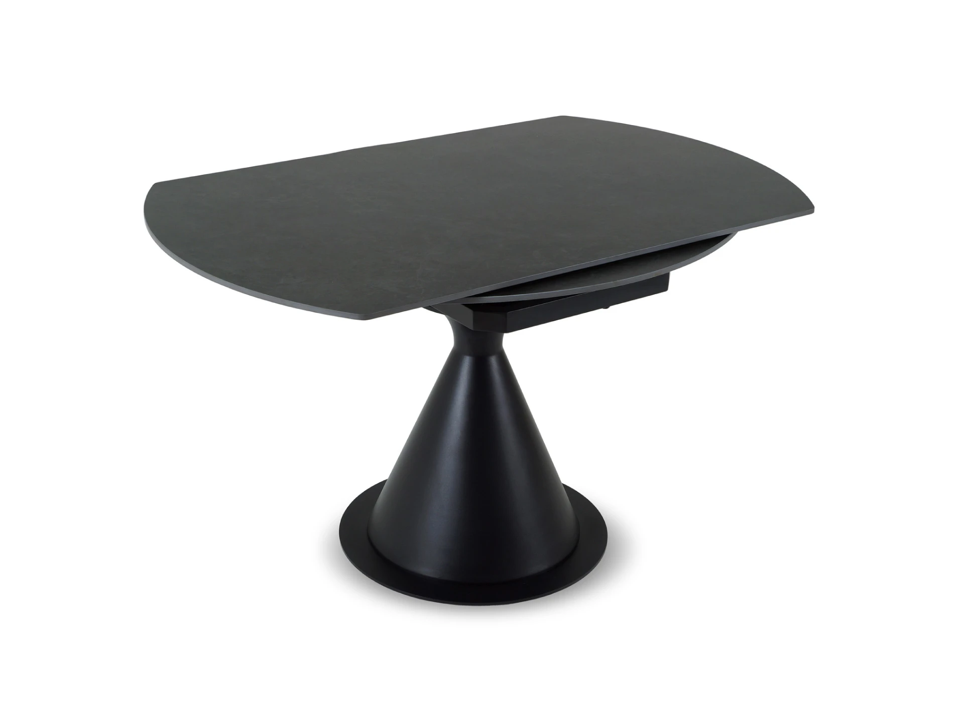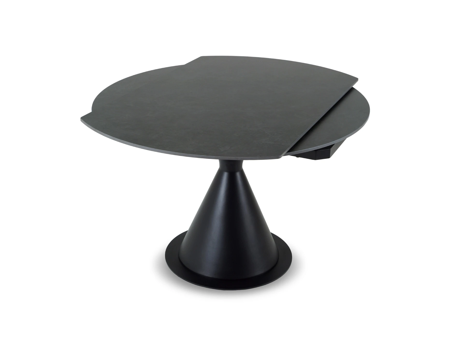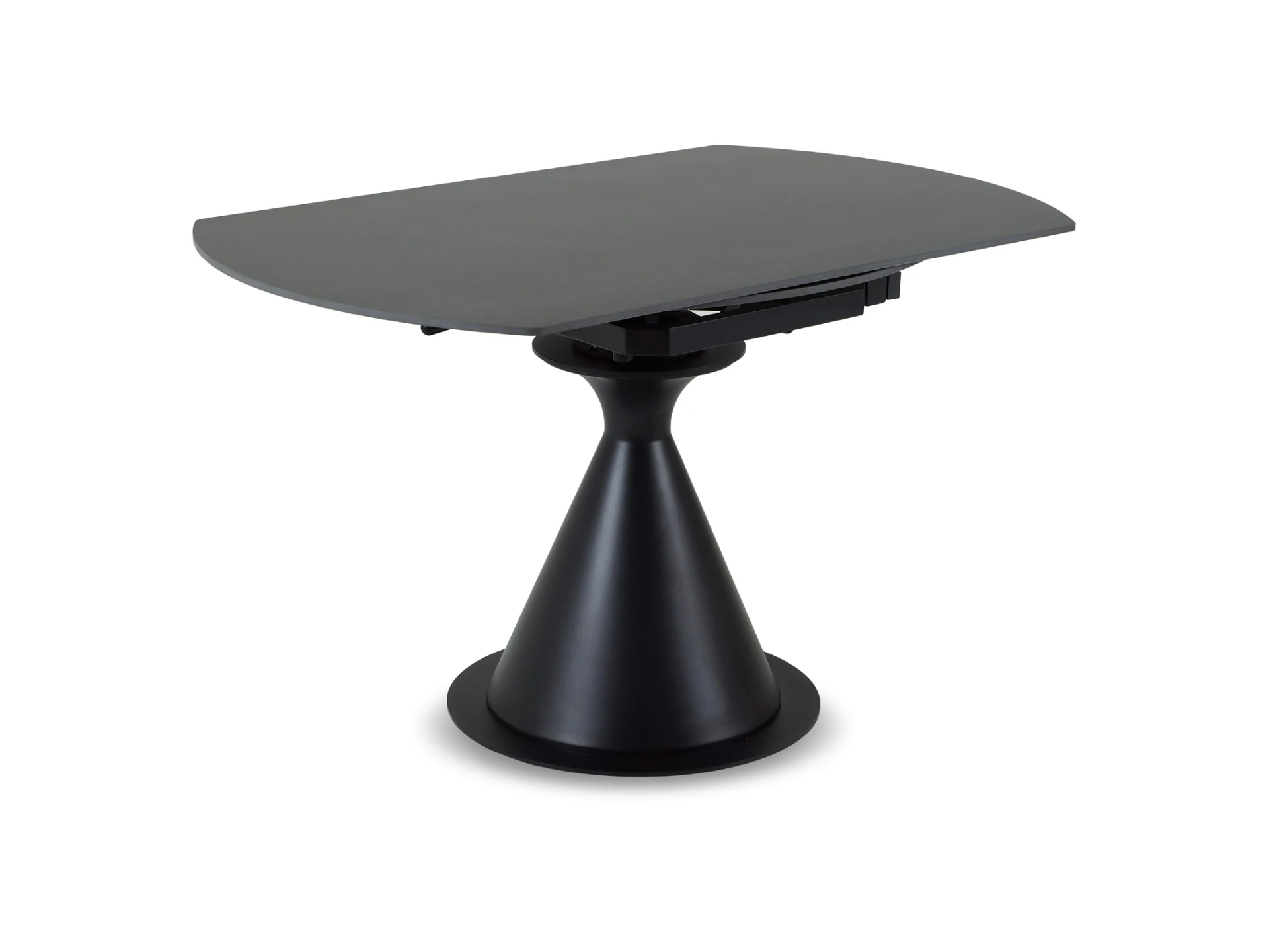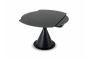 Основание — металл, выдерживающий большие нагрузки. Брутализм компонентов смягчается плавной архитектурой. Овальная столешница, которая может изменять форму на круглую, изящно поддерживается ножкой-конусом. Радиусные элементы добавят в пространство чувство безопасности, баланса, размеренности.