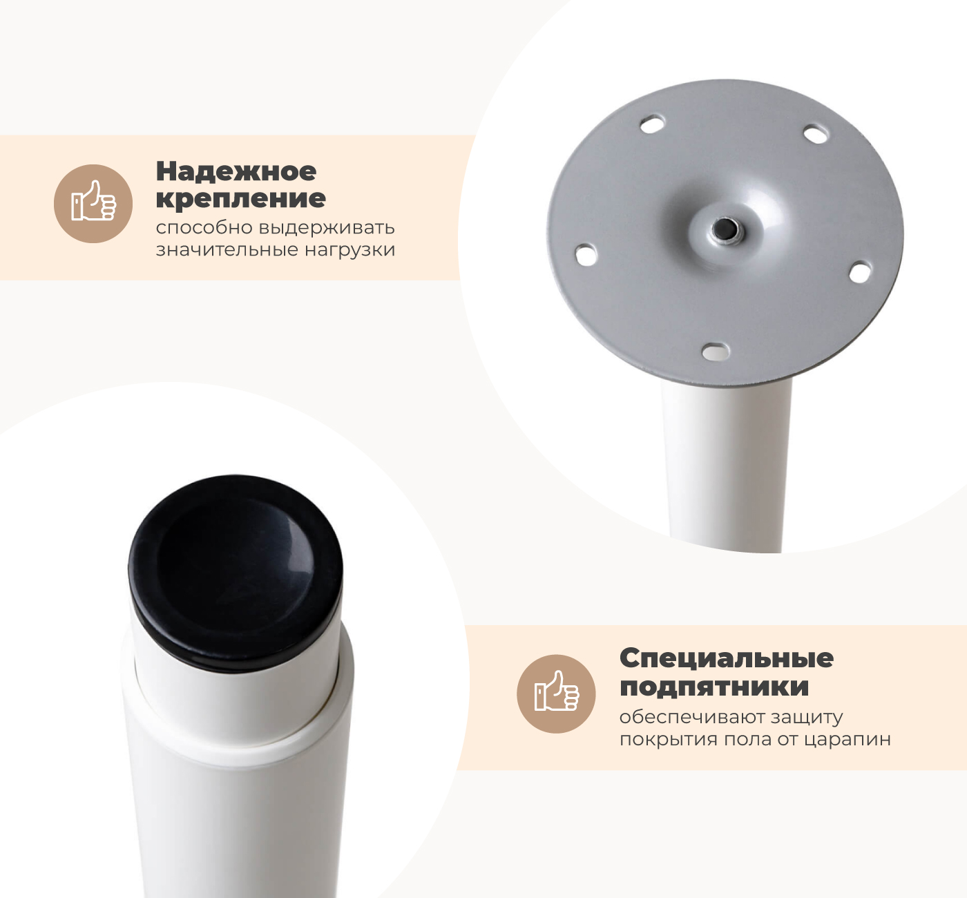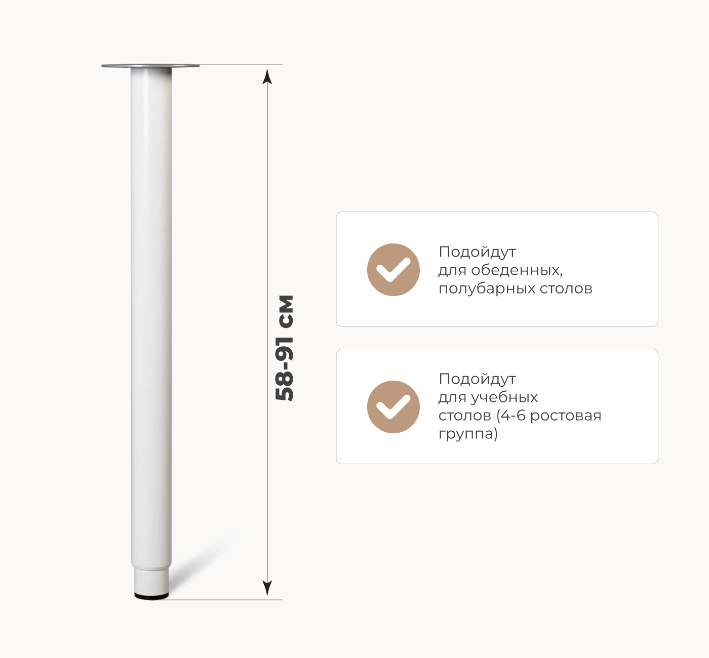 Главное преимущество опор для стола - возможность регулировать опору по высоте (58-91 см). Опоры подойдут для 4-6 ростовой группы, для полубарных столов. Осуществить регулировку опоры легко – поверните нижнюю часть опоры по часовой стрелке и установите нужную высоту, далее закрепите опору поворотом против часовой стрелки. Данные опоры позволят поддерживать правильную позу при работе и минимизировать нагрузку на позвоночник.