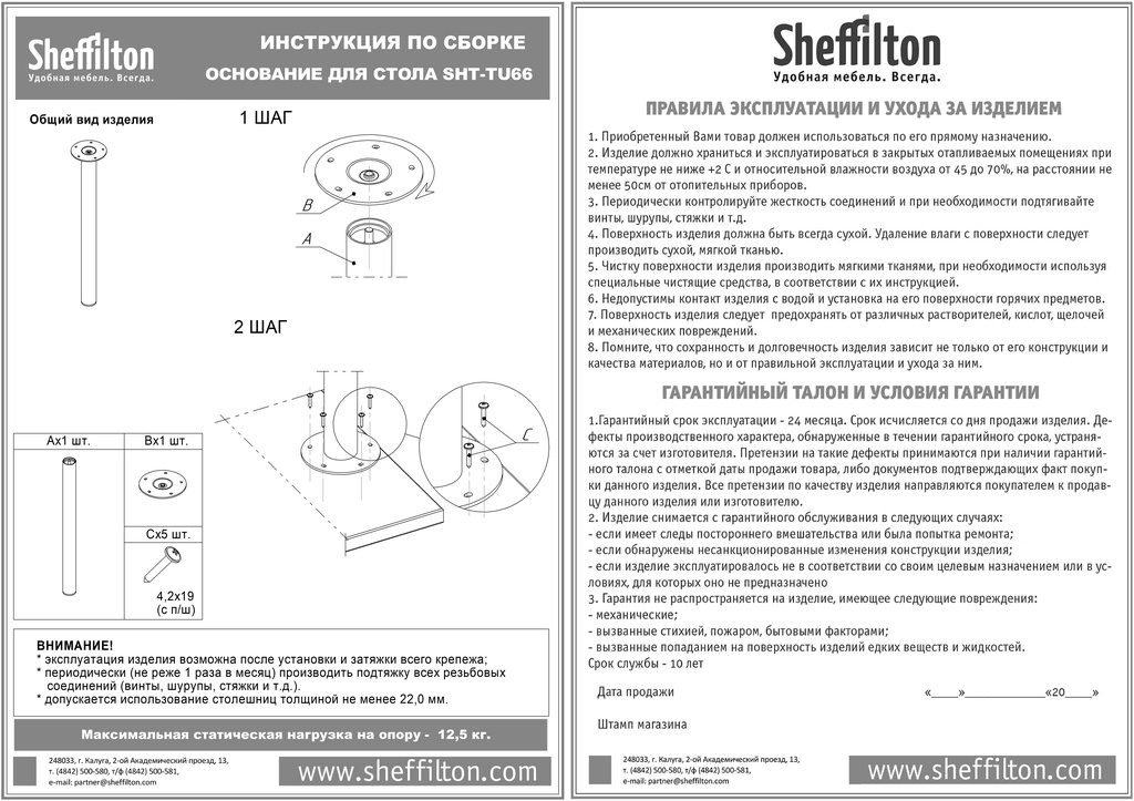 Максимальная статическая нагрузка на одну опору – 12,5 кг.