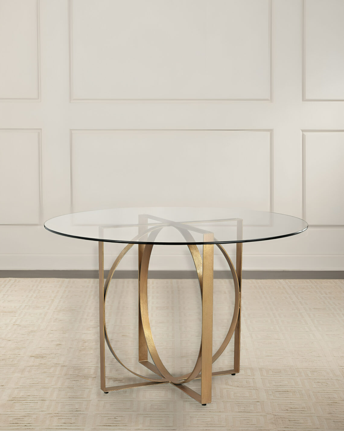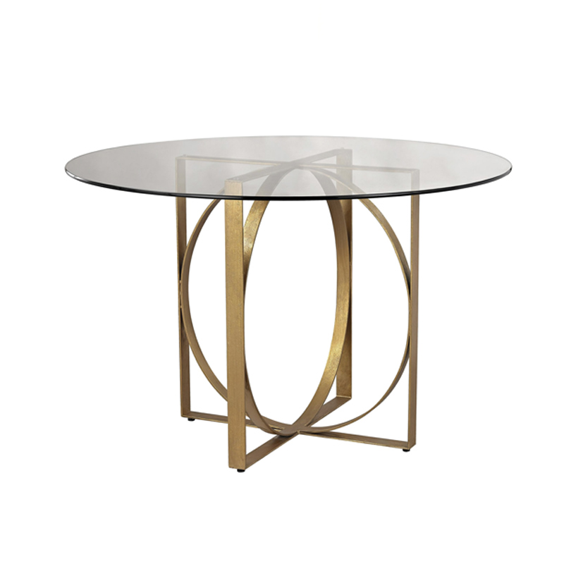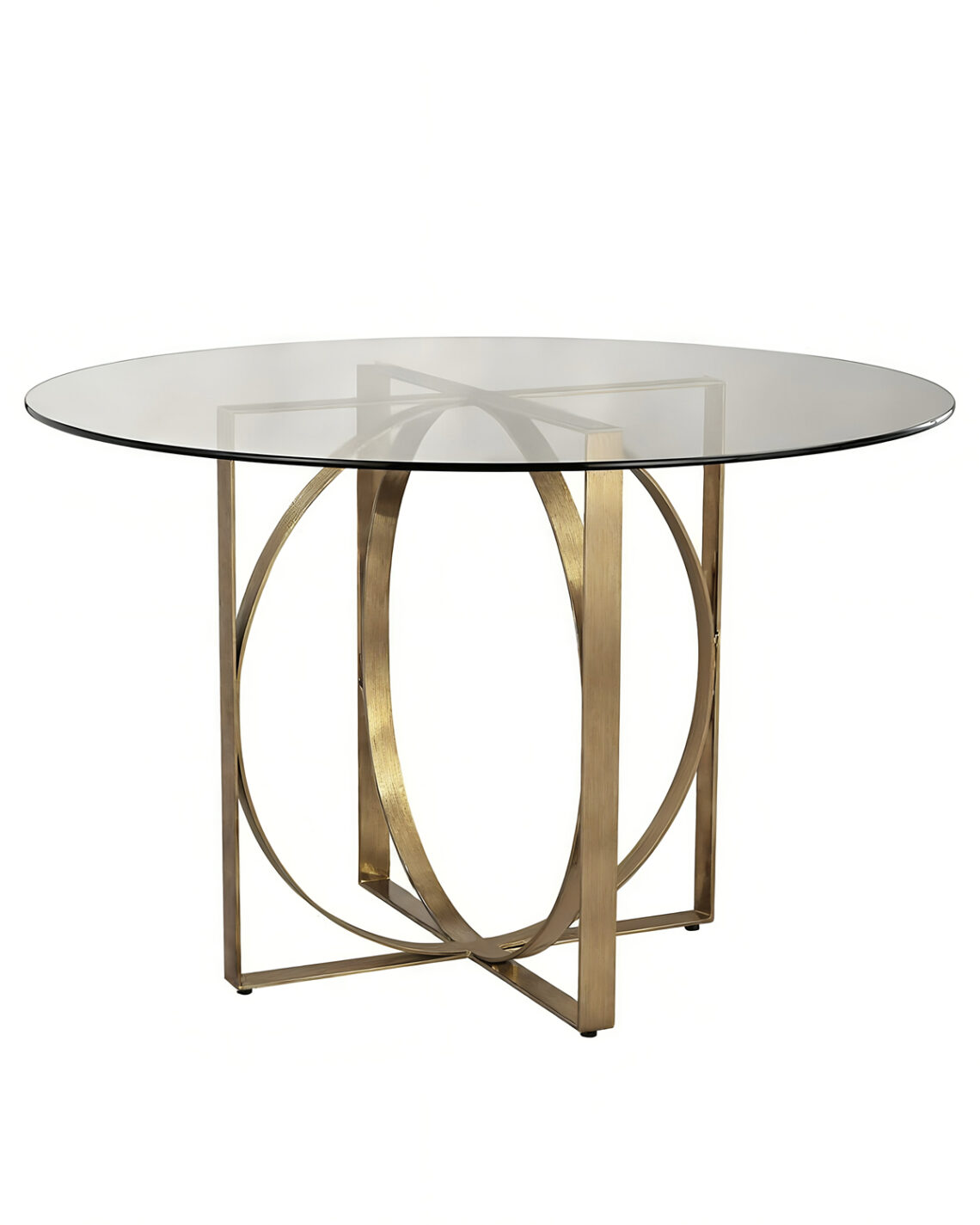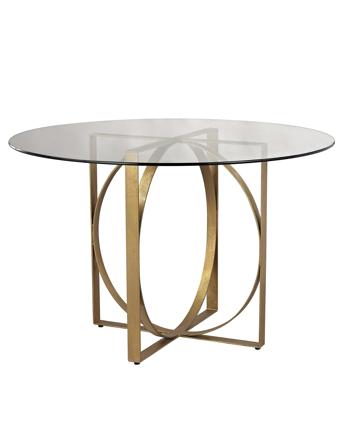 Запросить индивидуальное предложениеОбеденный стол “Трой” выполнен в виде двух пересекающихся колец, которые заключены в квадратную раму из металла. Стол являются одновременно стильным и современным силуэтом, демонстрирующий геометрический контраст и богатую отделку золотой поталью.