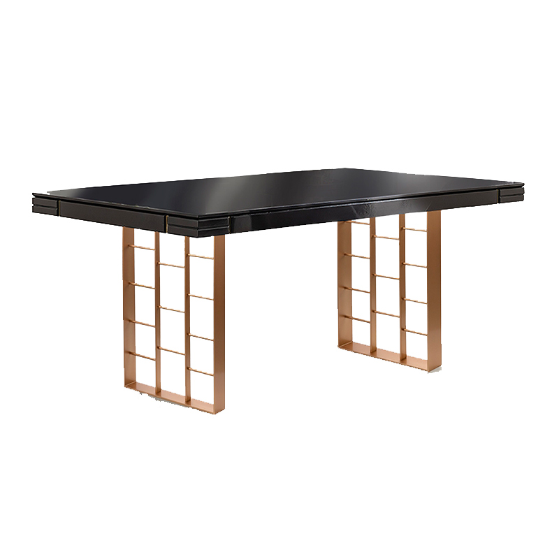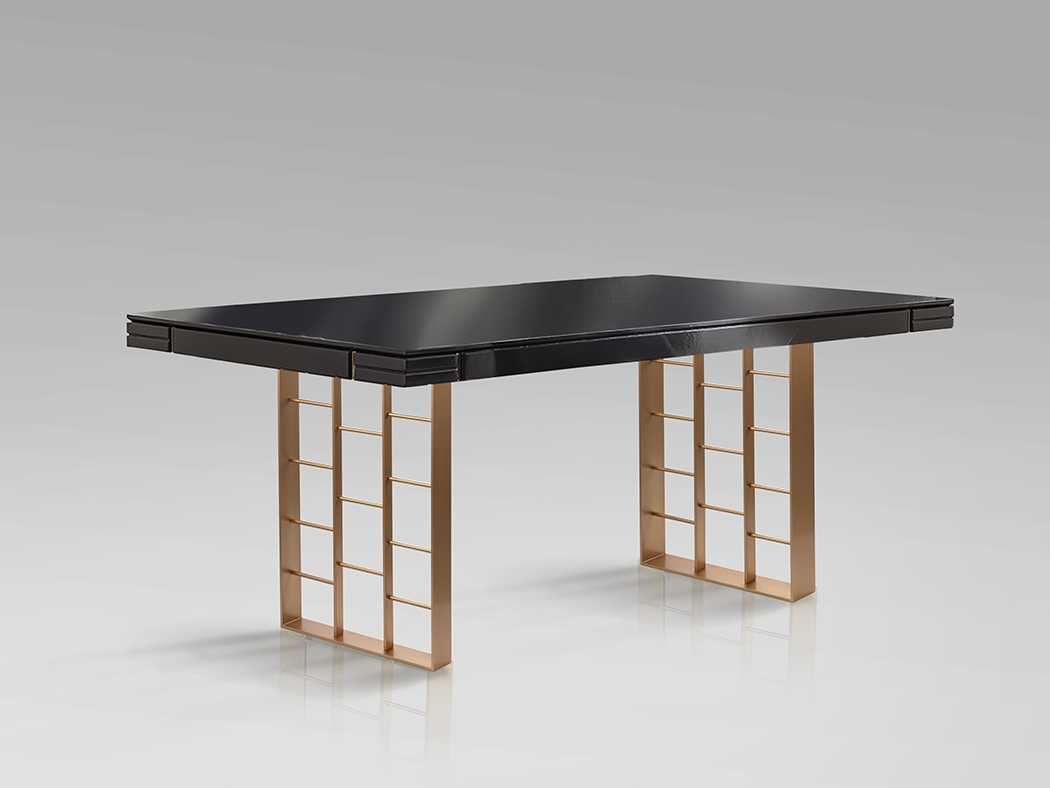 Запросить индивидуальное предложениеОбеденный стол из МДФ с отделкой антрацитово-серого цвета, глянцевый лак, с декоративными канавками и пластинами в золоте. Металлические ножки с матовой отделкой розовым золотом. Цвета отделки указываются в соответствии с каталогом производителя. Допускается незначительное отклонение в цвете, обусловленное техническими особенностями цветопередачи фотографий.