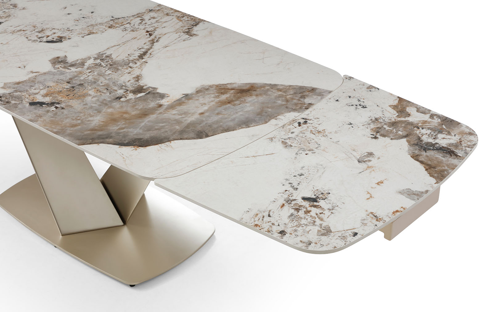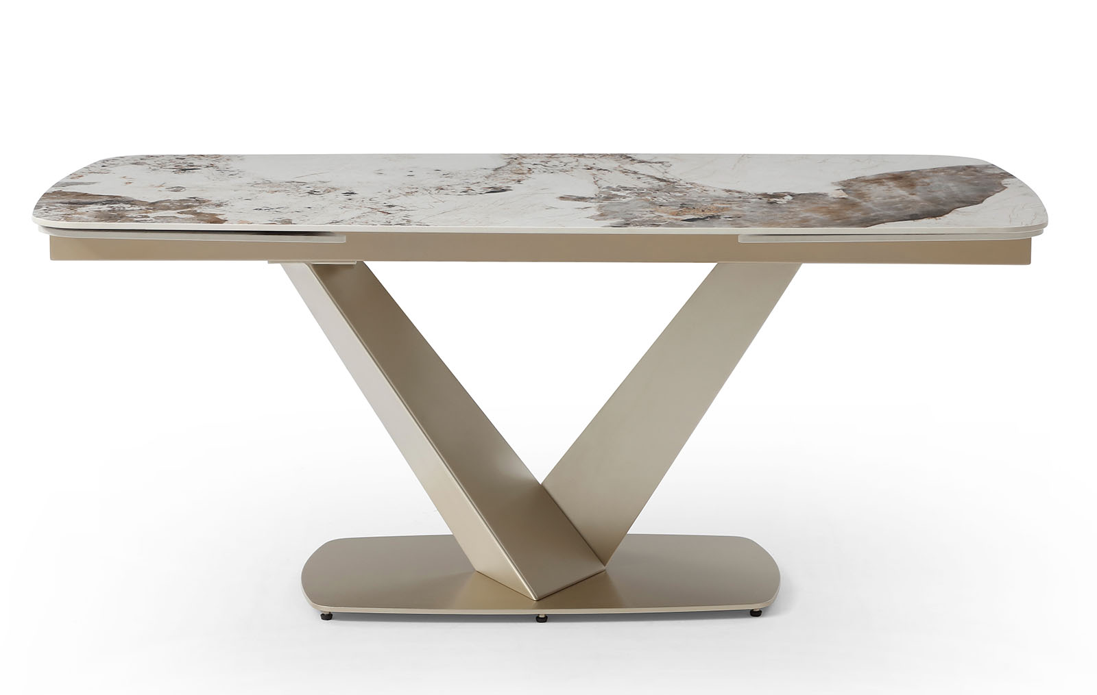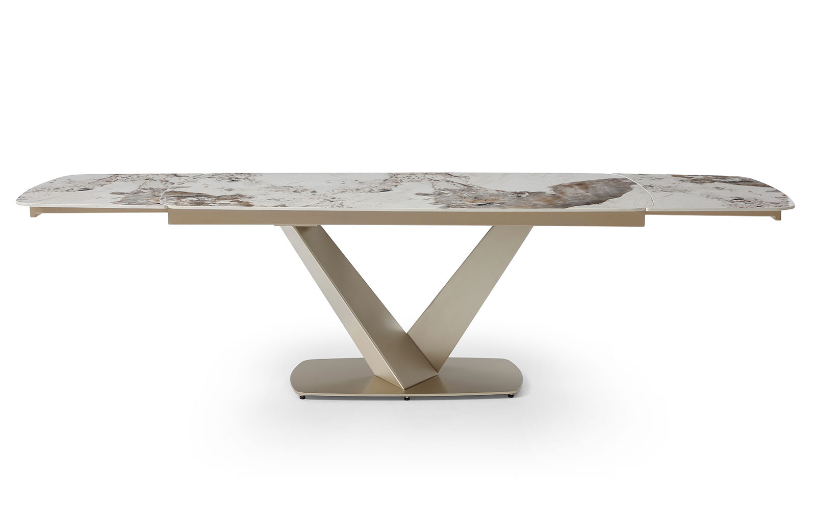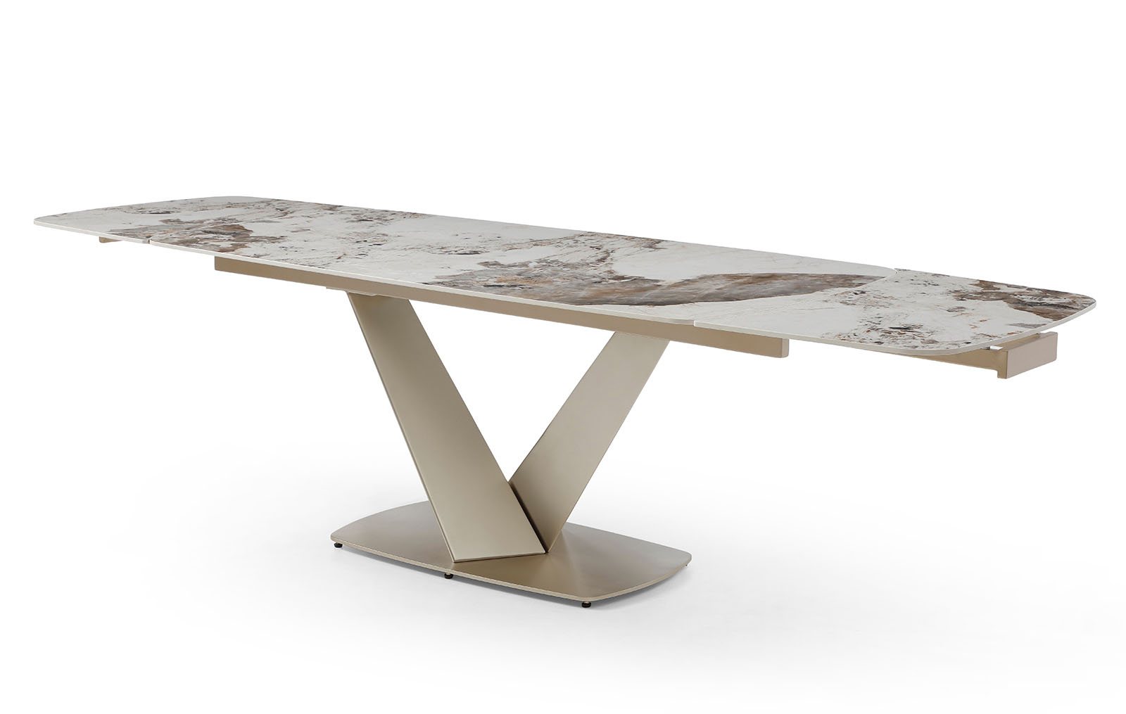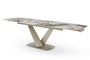 Запросить индивидуальное предложениеРаскладной обеденный стол Victoria (Виктория) с керамической столешницей на металлическом подстолье в цвете золотистый шампань.