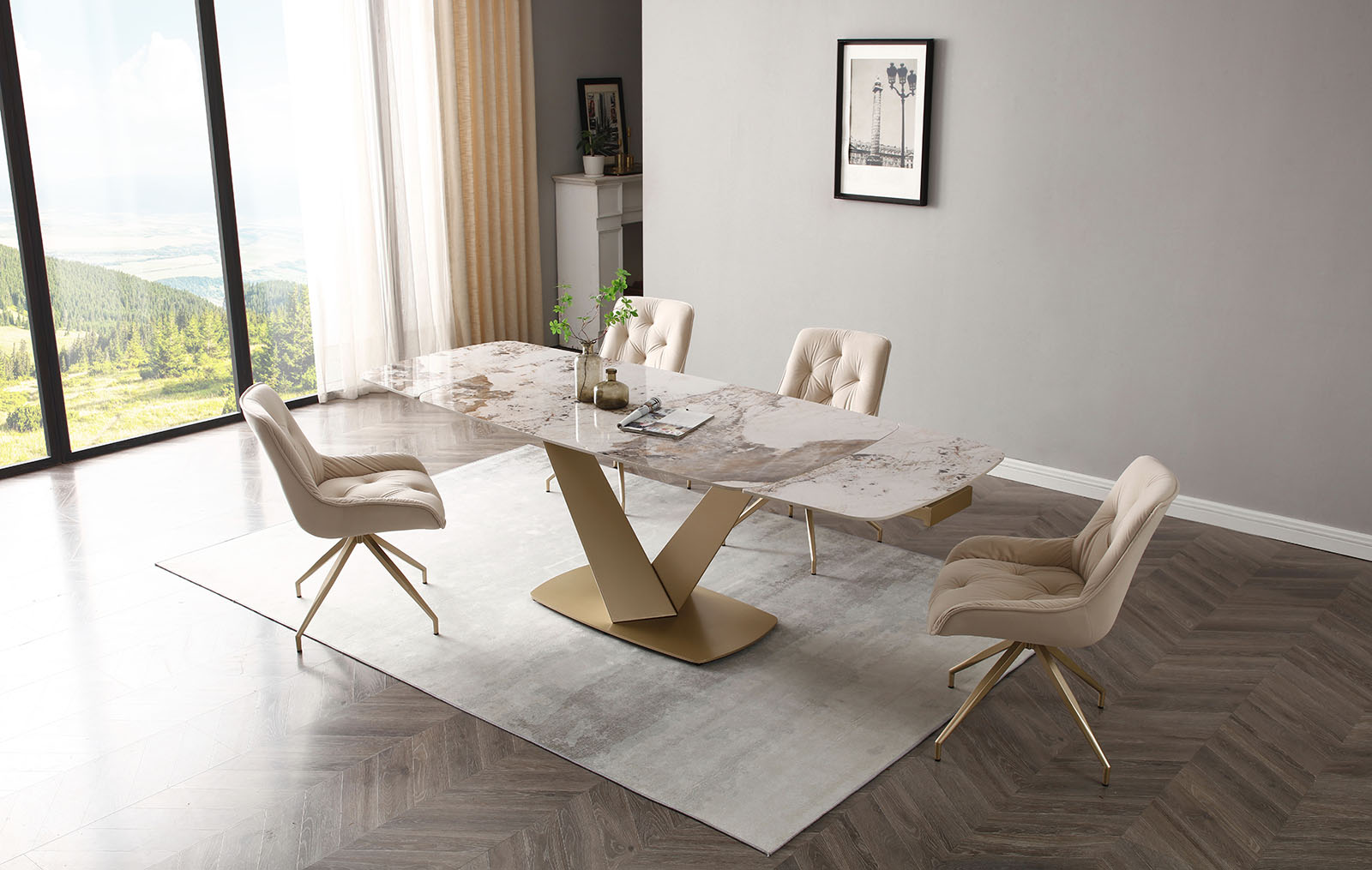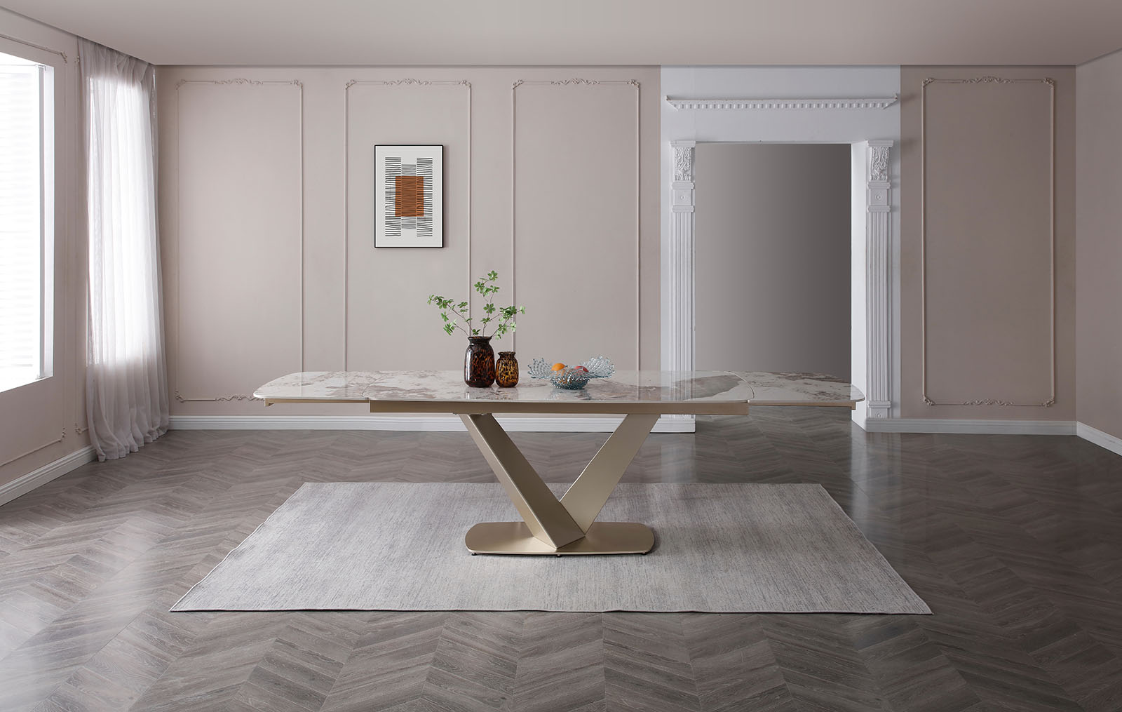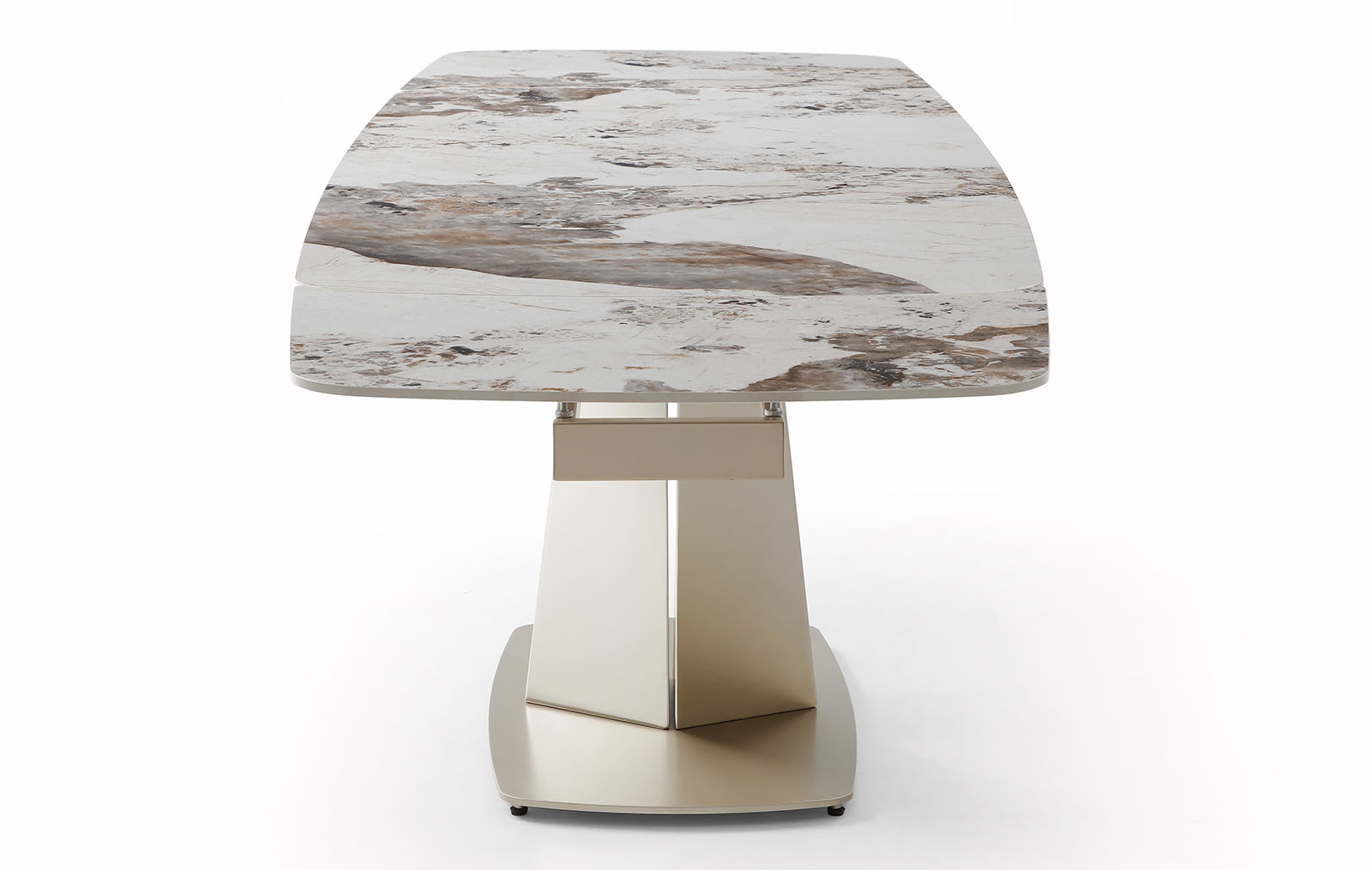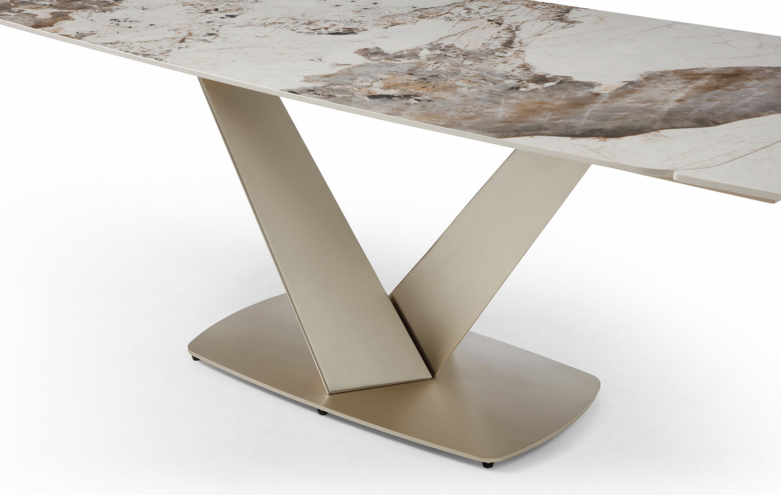 Запросить индивидуальное предложениеРаскладной обеденный стол Victoria (Виктория) с керамической столешницей на металлическом подстолье в цвете золотистый шампань.