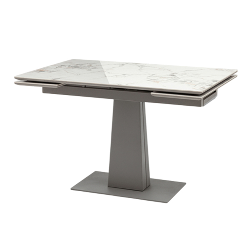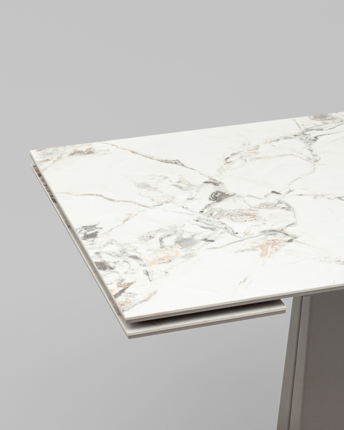 Столешница выполнена из высококачественной керамики (оттенок Cold jade) — материала, отличающегося не только эстетикой, но и высокой прочностью. Её мраморная текстура придаёт столу благородный вид, а также гарантирует устойчивость к влаге, загрязнениям и температурным перепадам. Материал не подвержен появлению пятен, царапин и прост в уходе — всё это делает стол идеальным для ежедневного использования.