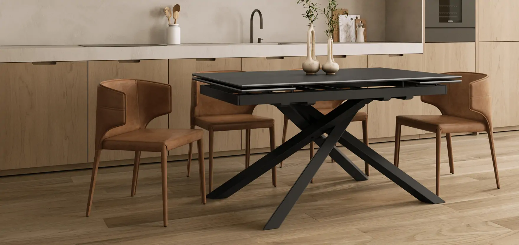 Дизайн. Прямоугольная форма стола и лаконичный стиль делают его универсальным решением для обеденной зоны. Темная керамическая поверхность придает модели современный и изысканный вид, а раскладной механизм позволяет адаптировать стол к различным ситуациям.