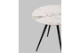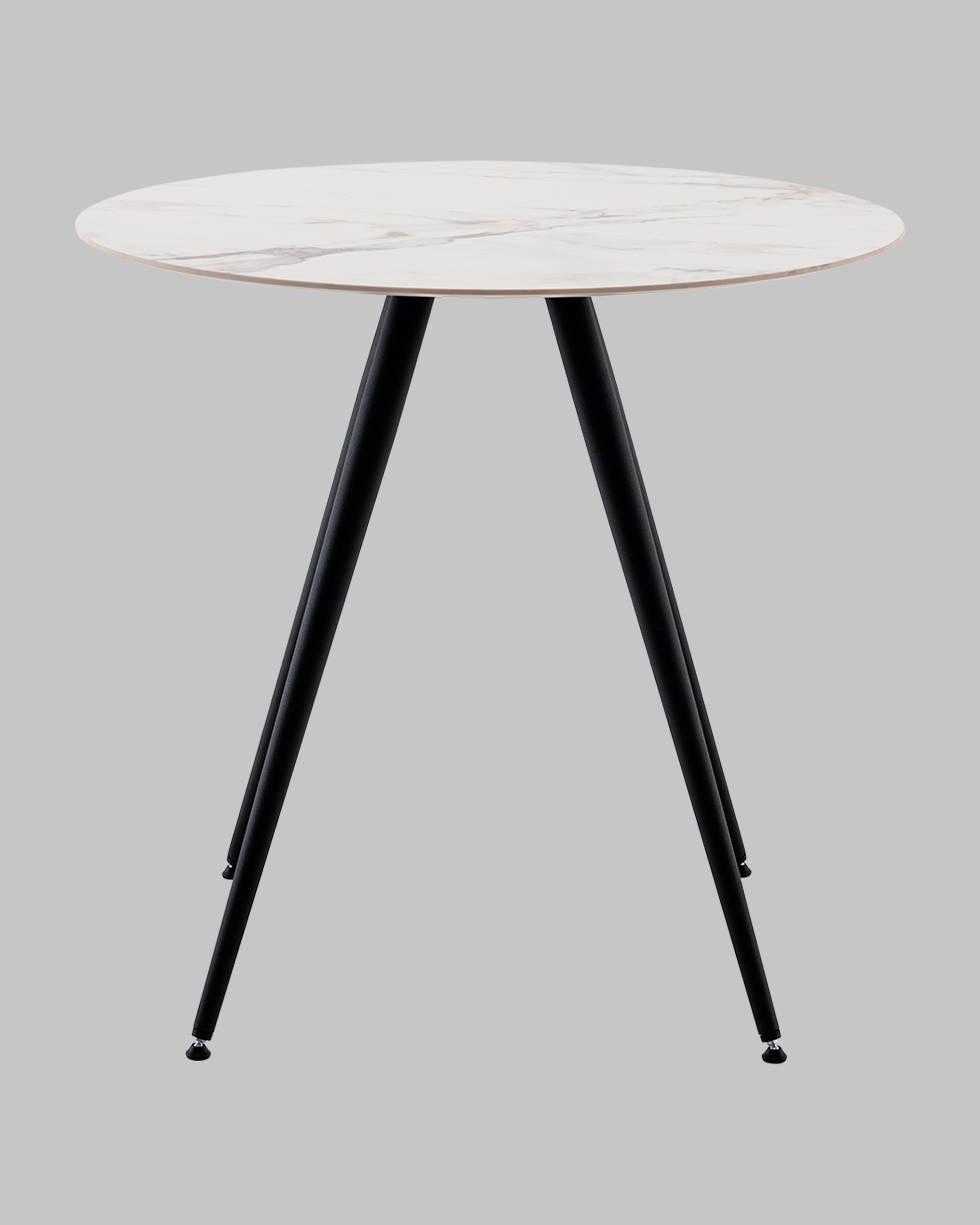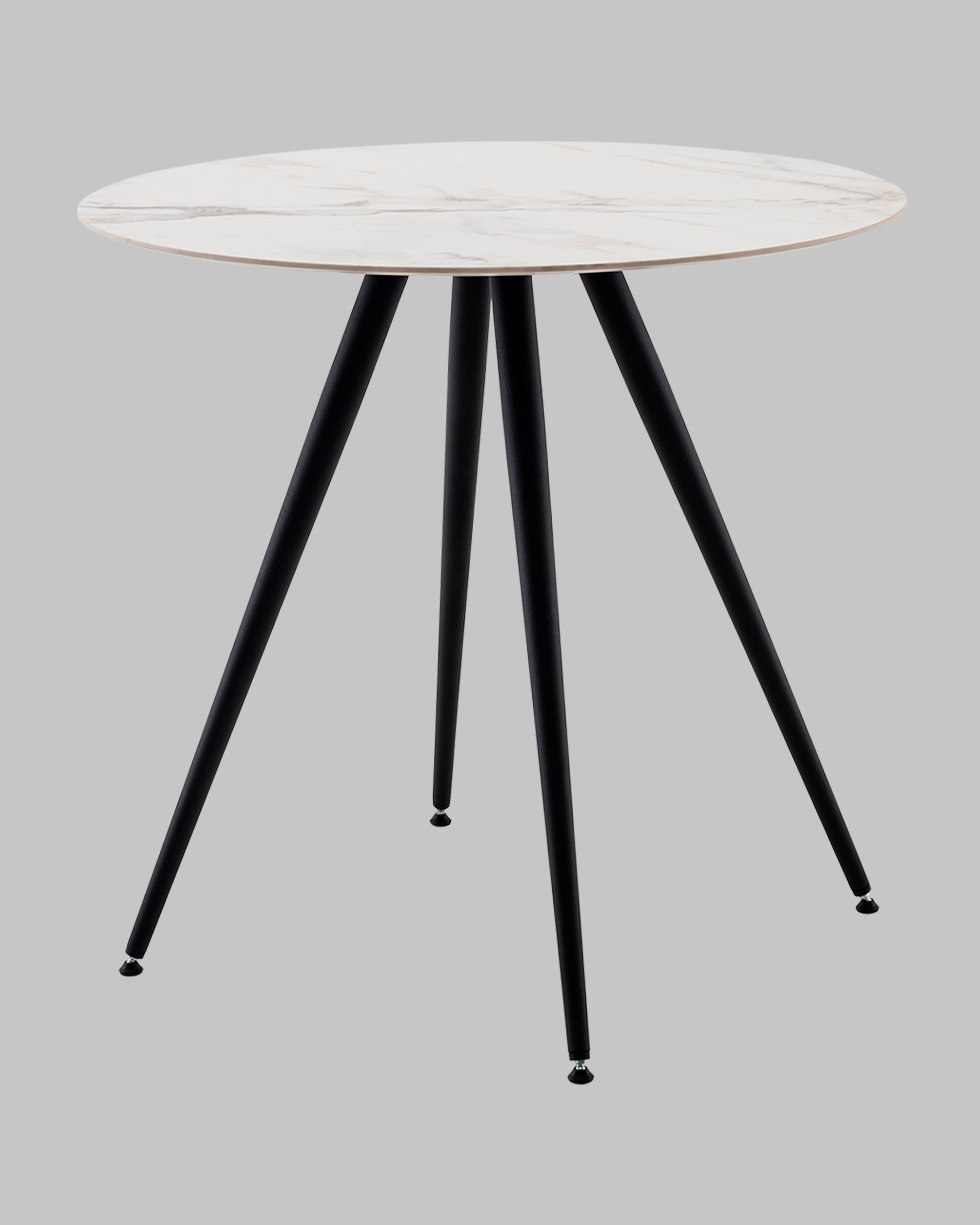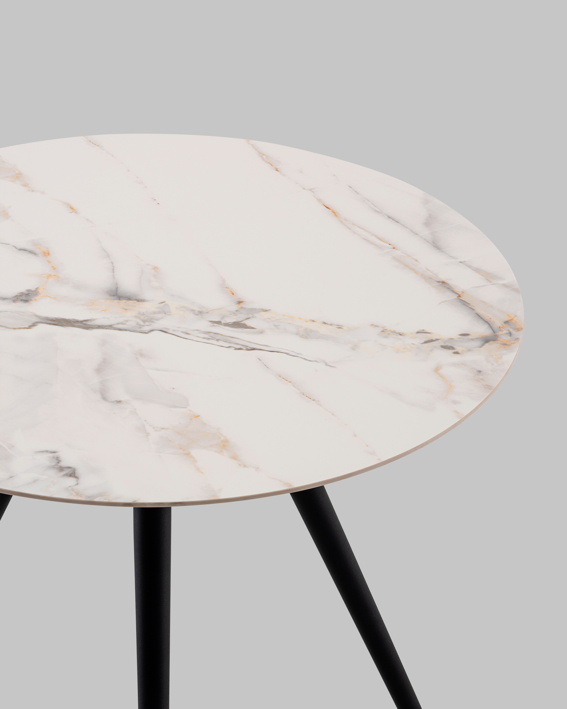 Материалы и конструкция. Столешница выполнена из прочной керамики — она устойчива к царапинам, перепадам температур и влаге, а также легко очищается. Чёрные металлические ножки обеспечивают устойчивость и визуальный контраст, подчёркивая современный характер модели.