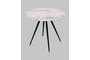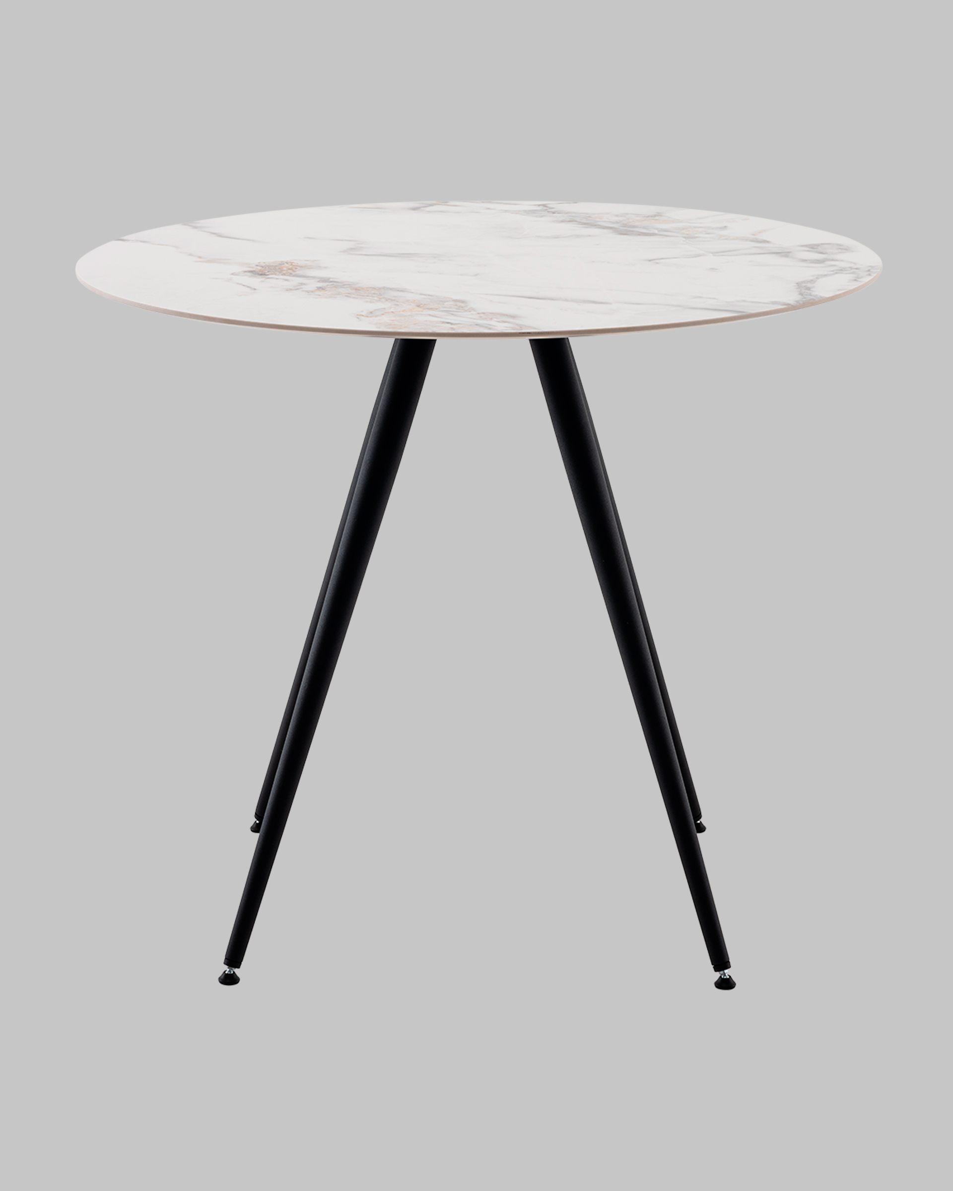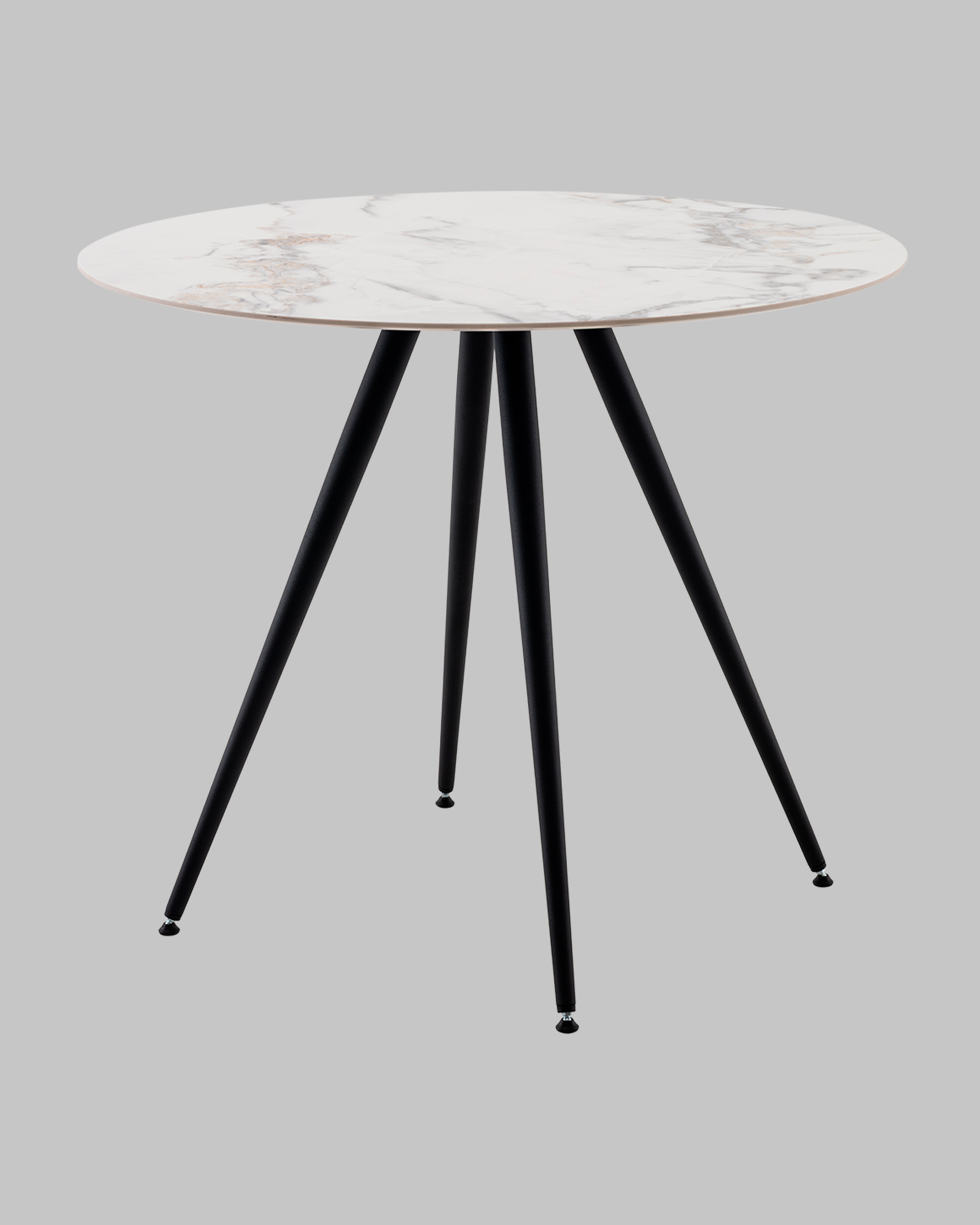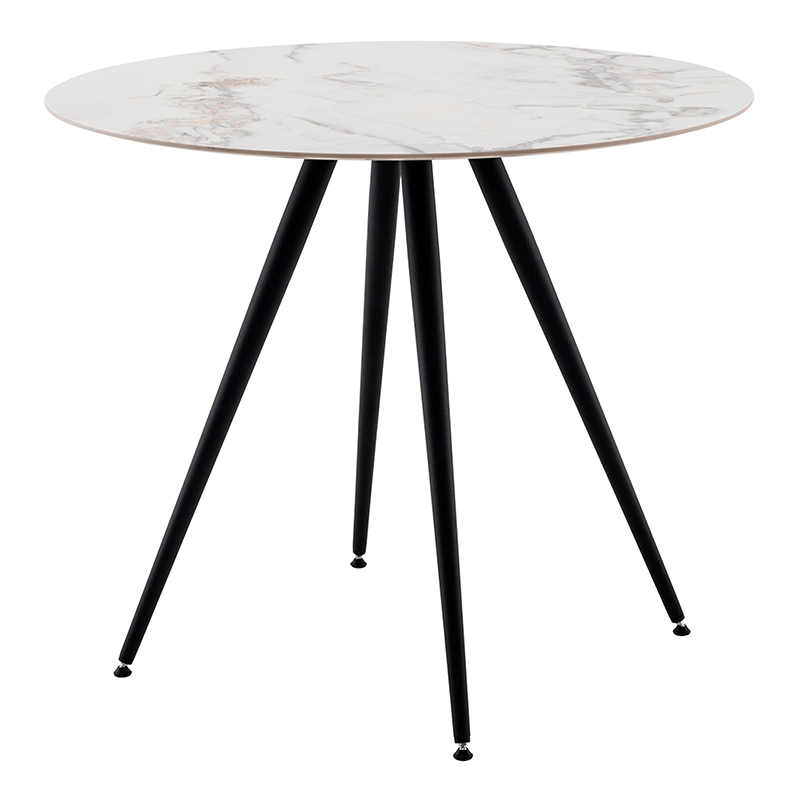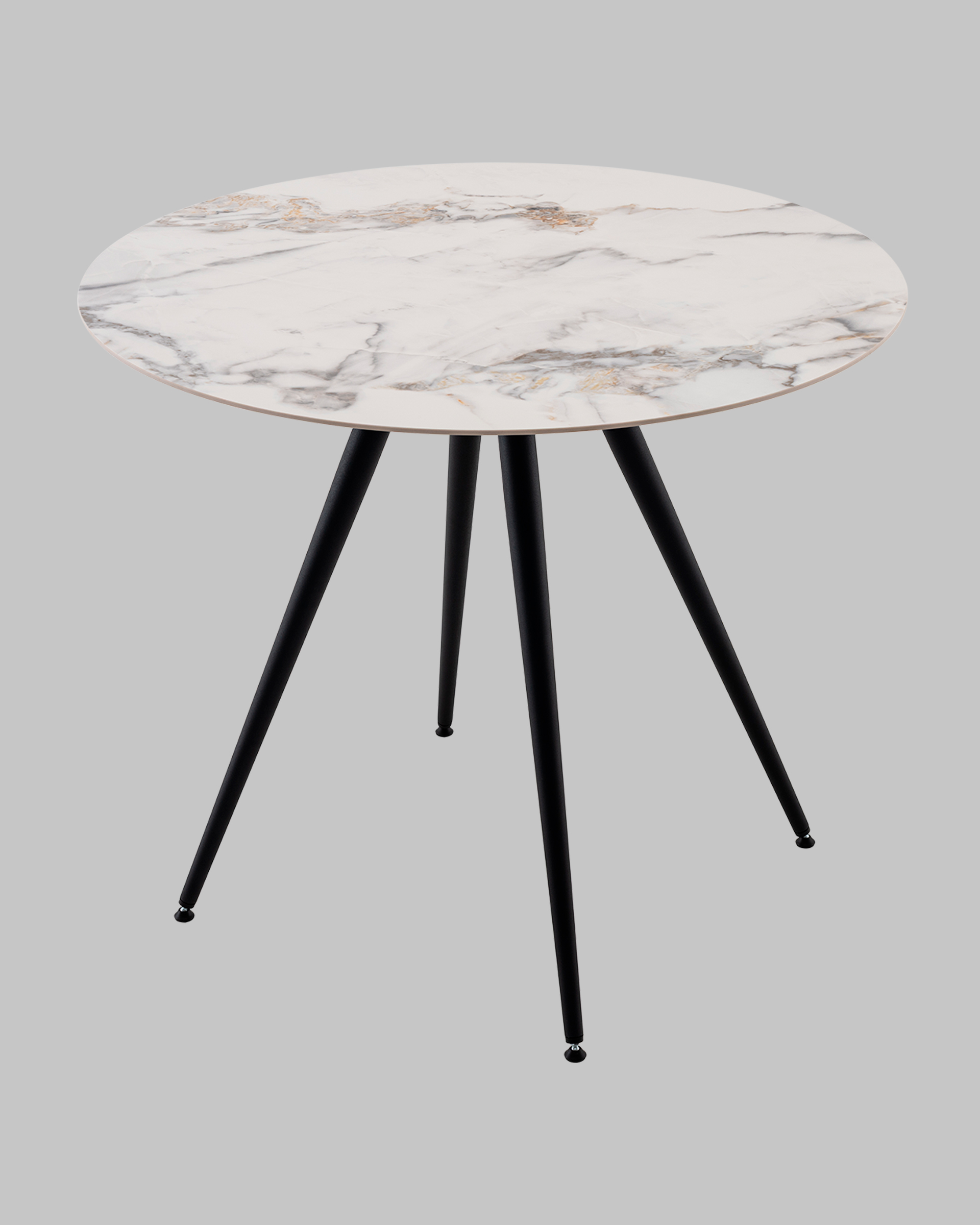 Материалы и конструкция. Столешница выполнена из прочной керамики — она устойчива к царапинам, перепадам температур и влаге, а также легко очищается. Чёрные металлические ножки обеспечивают устойчивость и визуальный контраст, подчёркивая современный характер модели.