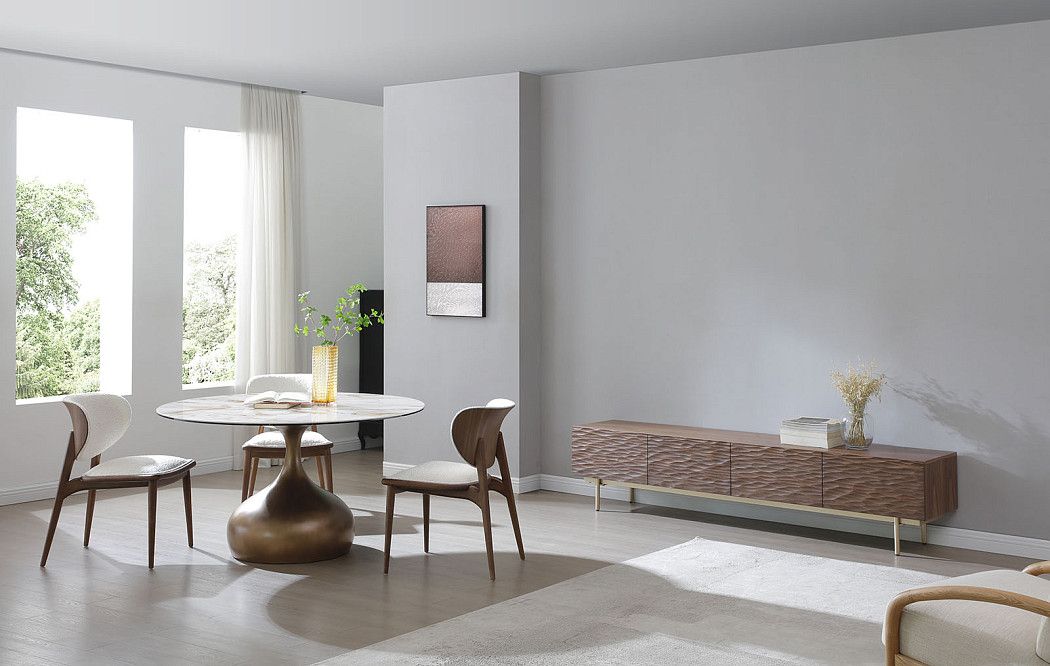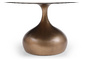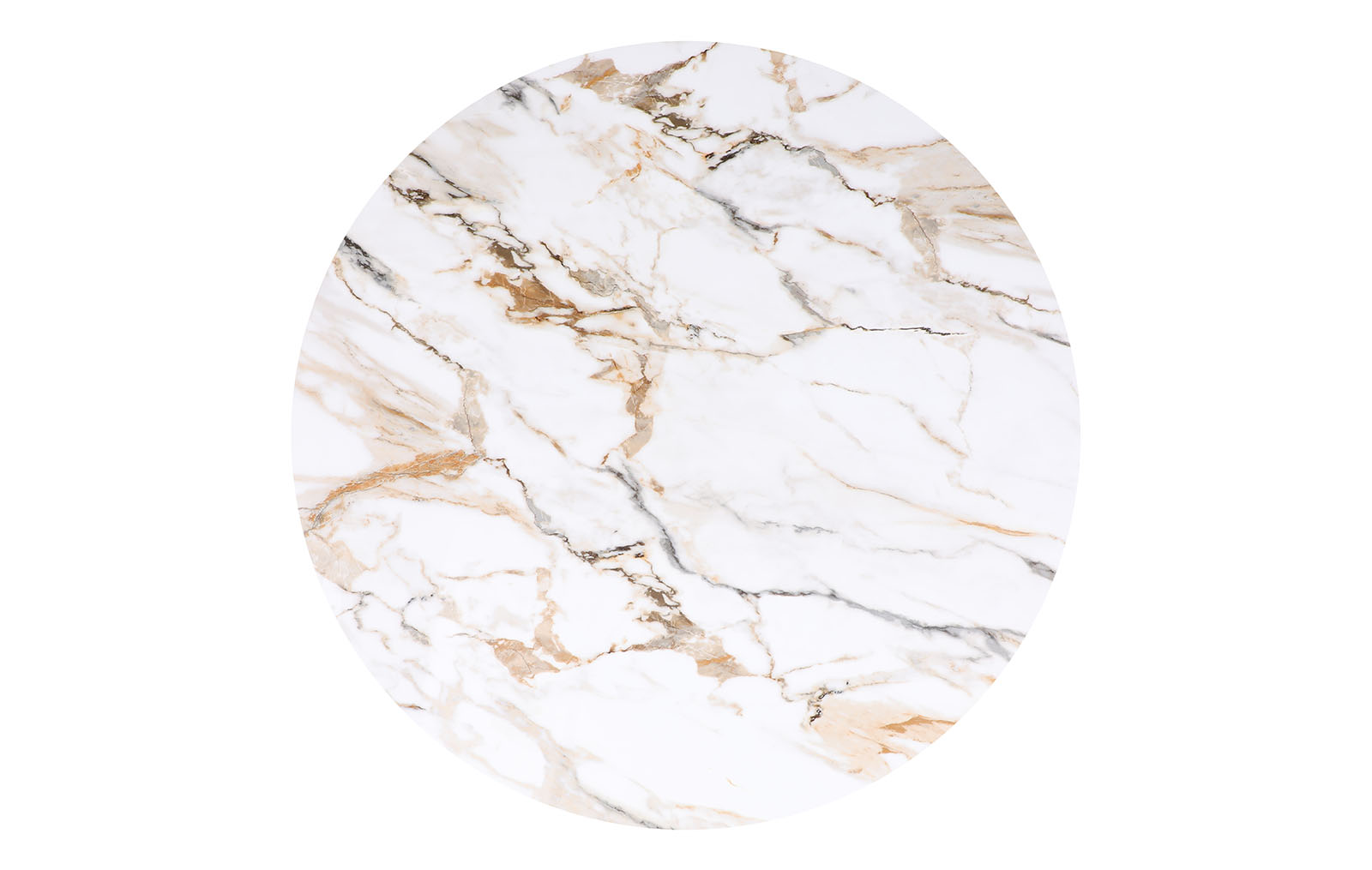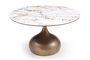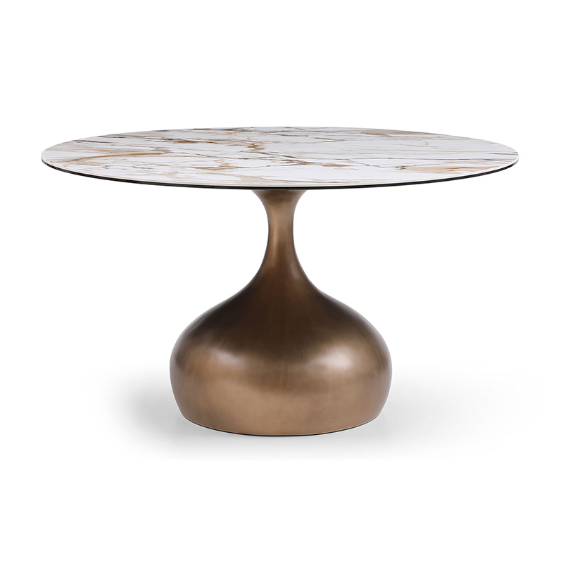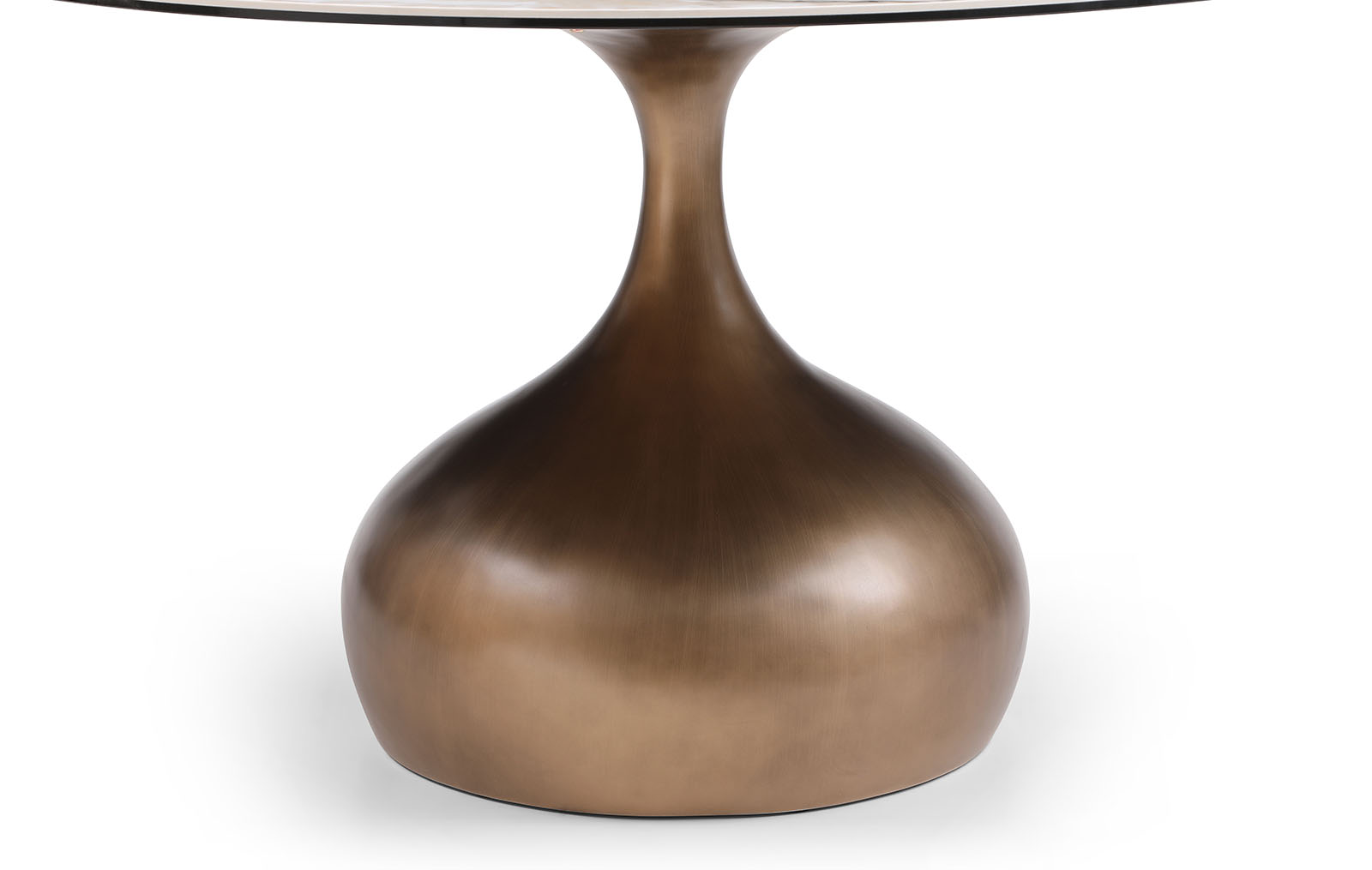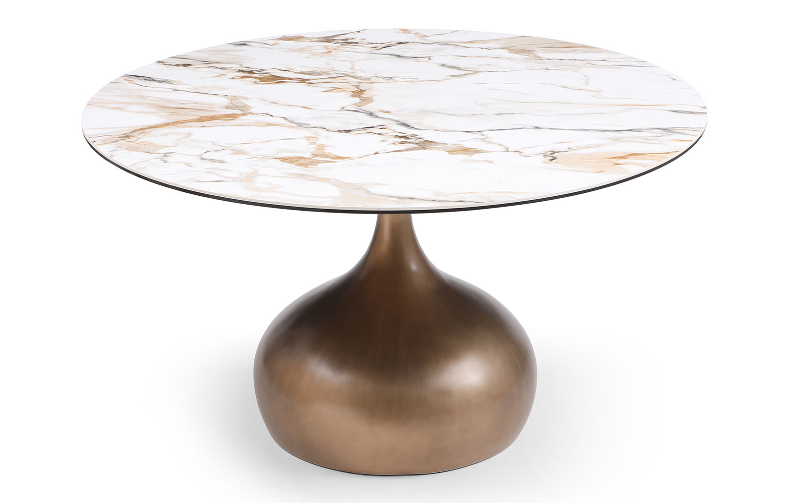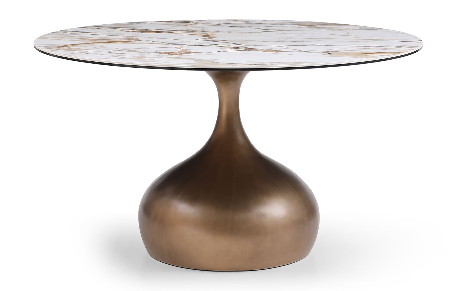 Круглая столешница из керамики и стекла имеет общую толщину 14 мм и диаметр 135 см. Ножка сделана из стекловолокна в матовом бронзовом оттенке.