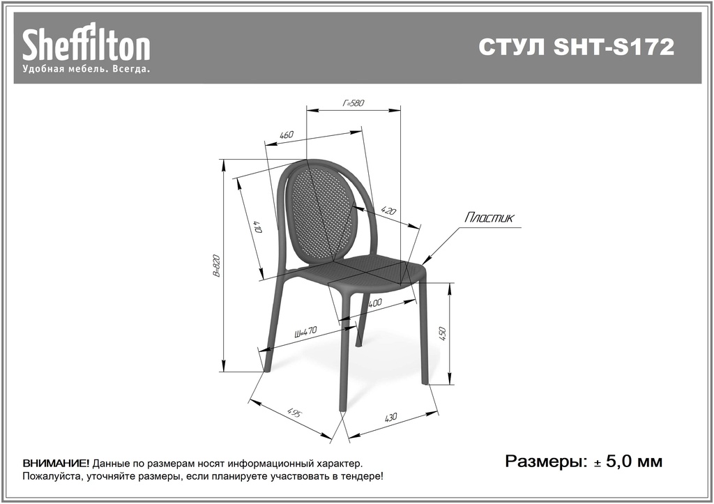 Стул выполнен из полипропилена с армирующими добавками, благодаря которым повышается жесткость и надежность.