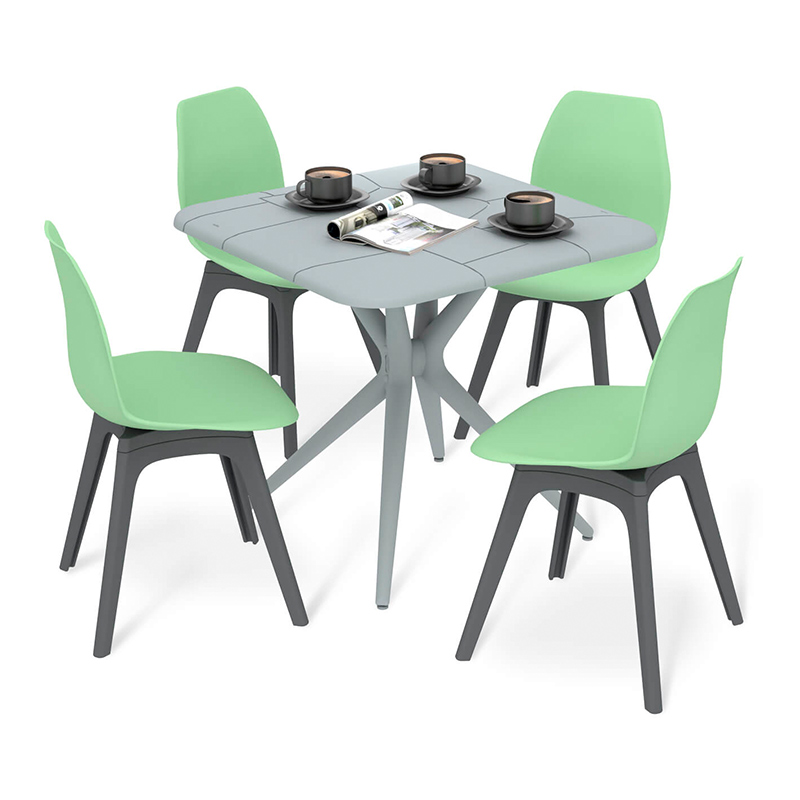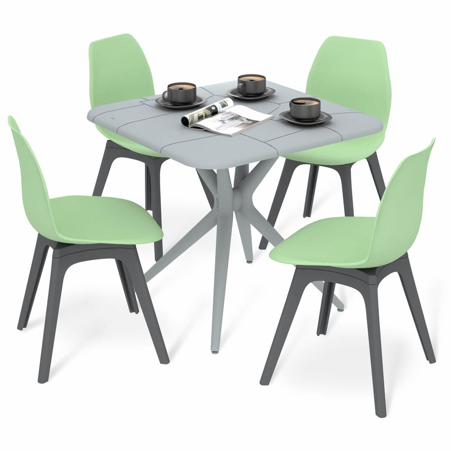 Обеденная группа выполнена из полипропилена с армирующими добавками, благодаря которым повышается жесткость и надежность. Изделия устойчивы к ударным воздействиям, негативным воздействиям окружающей среды и появлению царапин.