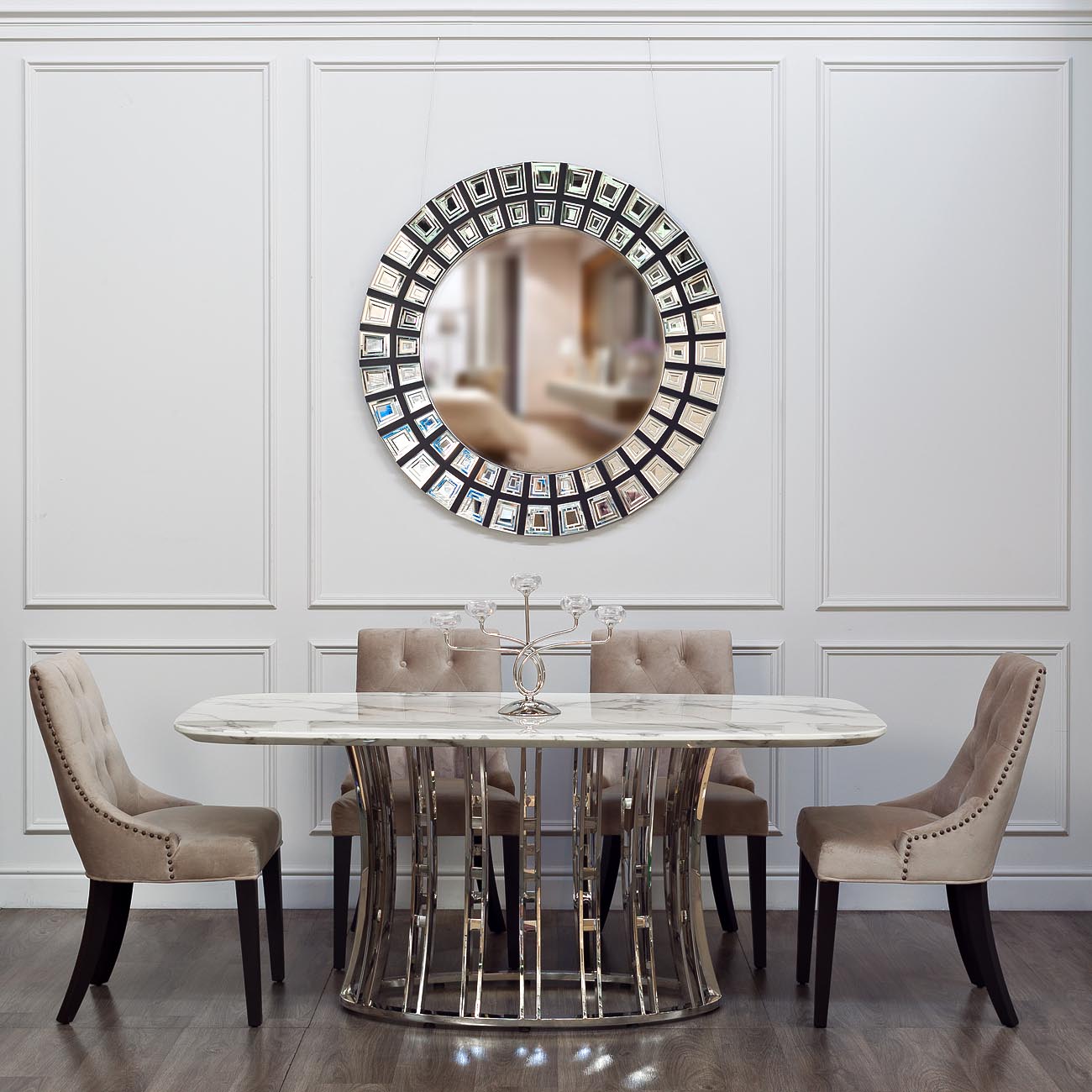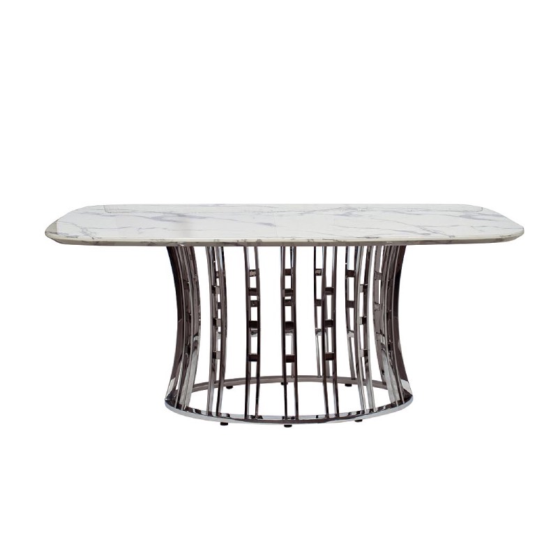 Запросить индивидуальное предложениеОбеденный стол Exclusive со столешницей из природного камня, ламинированного пленкой из ПВХ с рисунком благородного мрамора на основании из нержавеющей стали - приобретение в стиле ар-деко для вашей столовой или гостиной. Сервированный хрусталем и фарфором, отражающий блеск свечей или красоту живых цветов он является воплощением Art de vivre - искусства жить, как говорят французы. Плавные линии, сочетание полированного камня с модной сталью располагают как к изысканной трапезе, так и к утонченной беседе. Столешница - природный камень с полимерным покрытием под мрамор на подстолье из МДФ