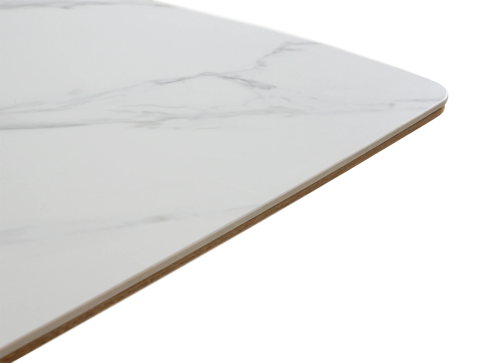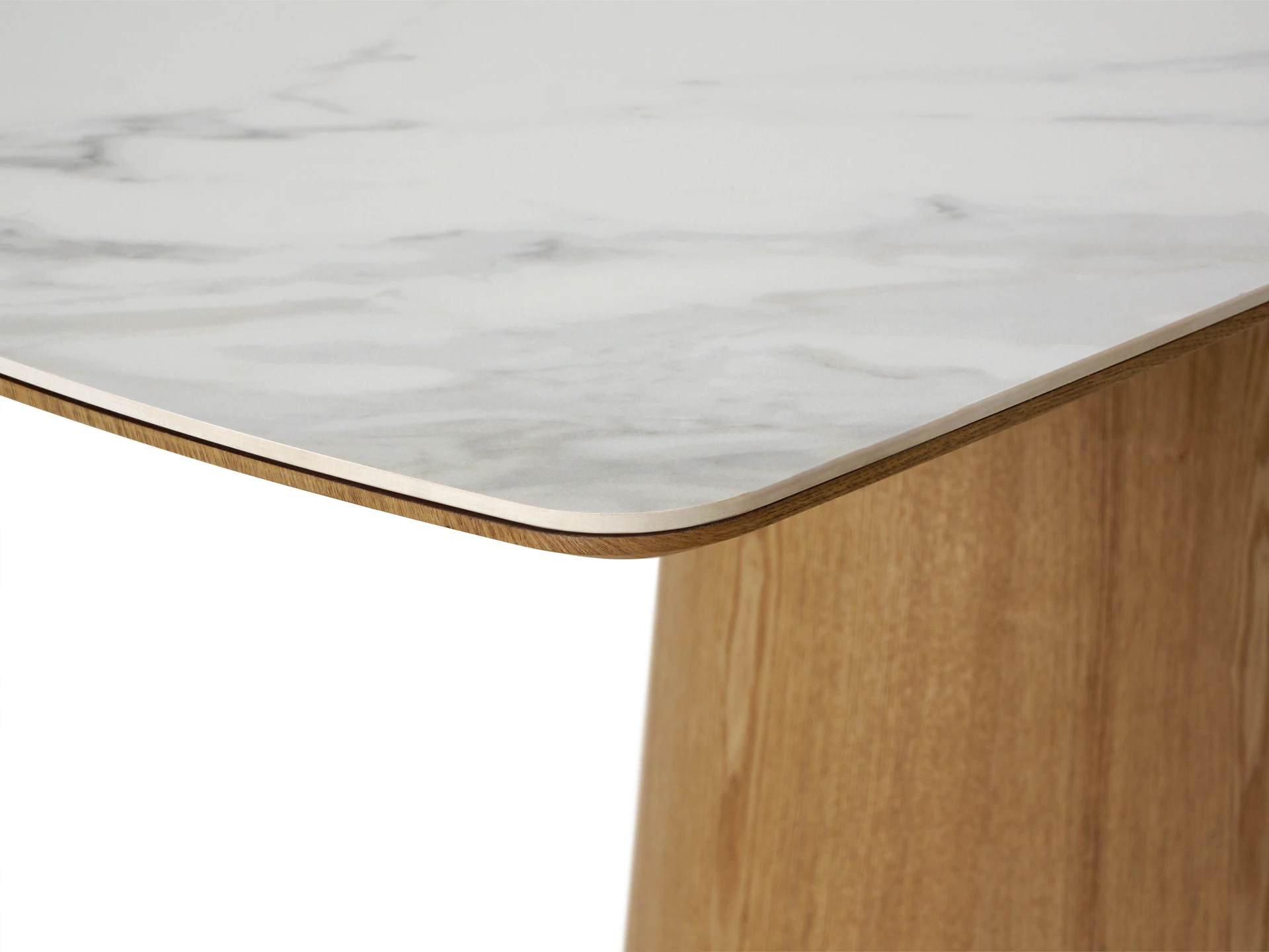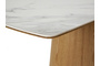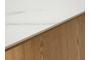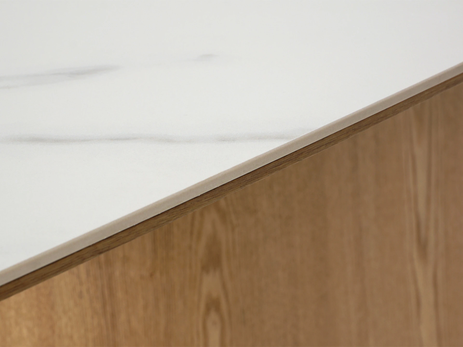 Столешница выполнена из белой матовой керамики на основе из МДФ с отделкой натуральным шпоном дуба. Такая комбинация материалов не только подчёркивает утончённый внешний вид, но и обеспечивает высокую устойчивость к механическим повреждениям, термическому воздействию и загрязнениям. Материал основания - МДФ облицованный натуральным шпоном дуба.