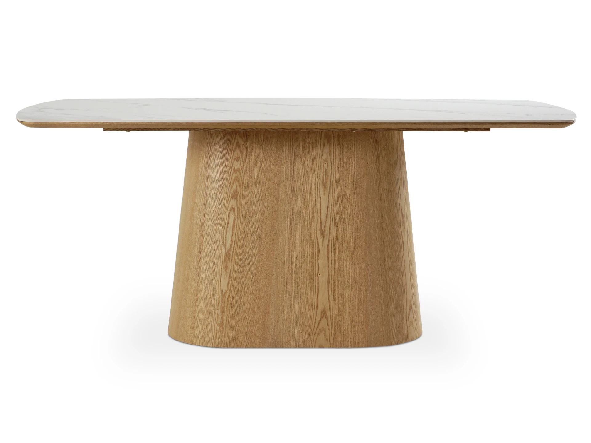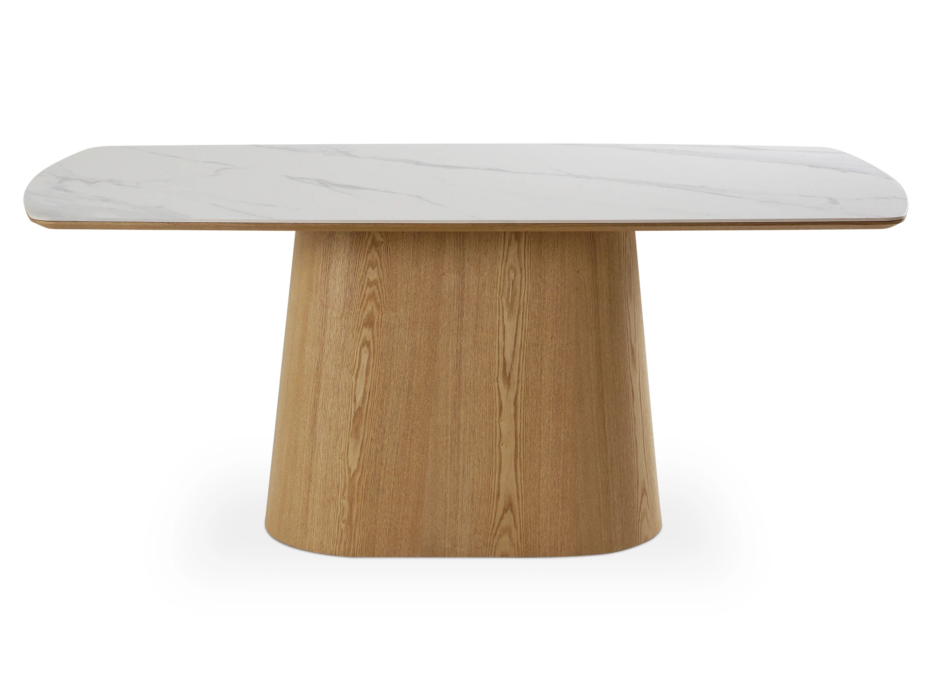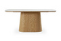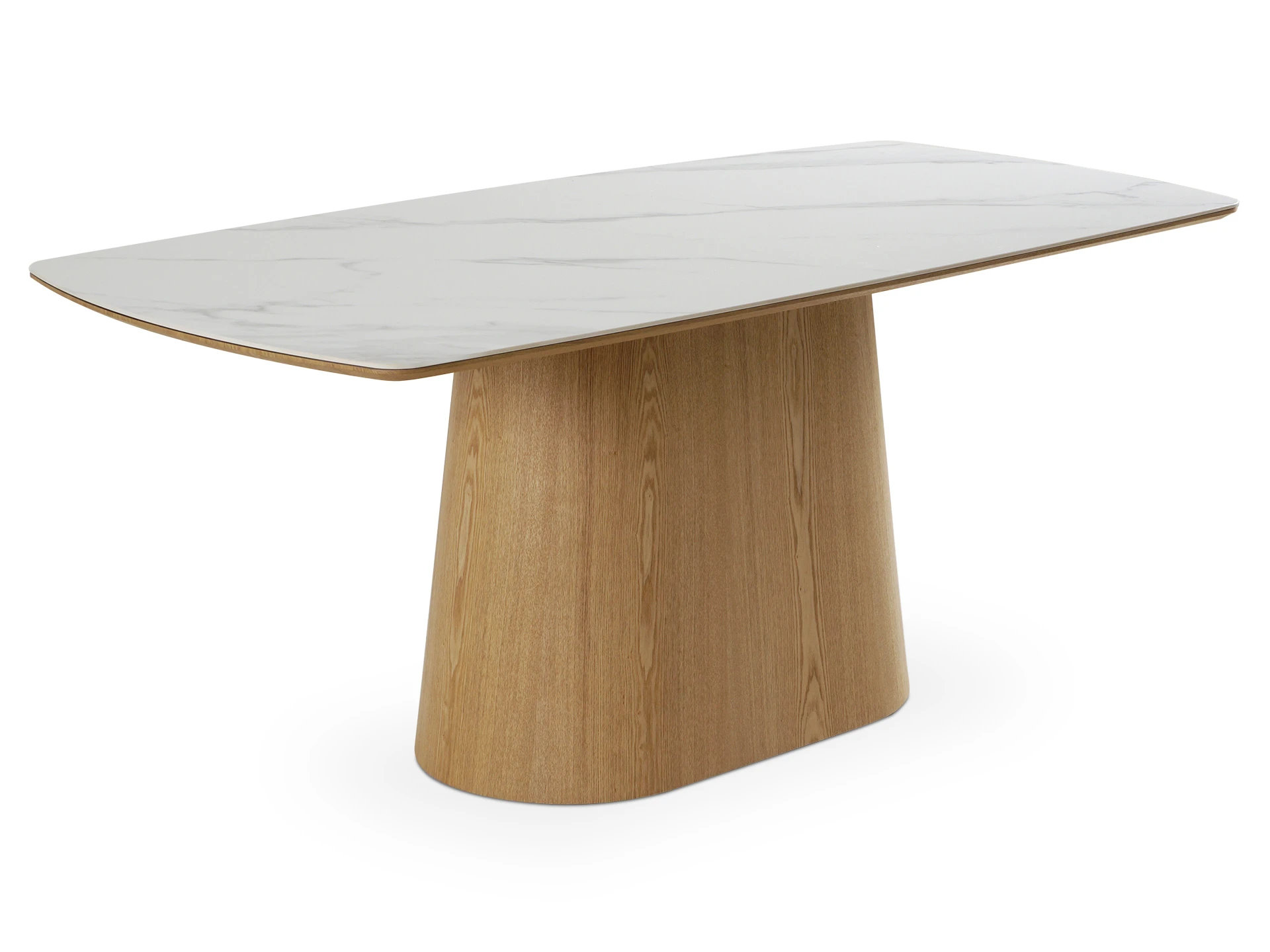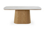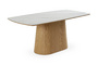 Запросить индивидуальное предложениеОбеденный стол с лаконичным характером для актуальных интерьеров. Трапециевидное внушительное основание поддерживает прямоугольную столешницу из белой матовой керамики на основе МДФ с отделкой натуральным шпоном дуба. Который отличается прочностью, долговечностью и привлекательной текстурой.