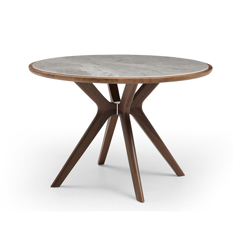 Столешница сделана из многослойной фанеры с керамическим покрытием толщиной 6 мм и в шпоне ореха по краю. Ножки стола сделаны из натурального дерева в шпоне ореха.