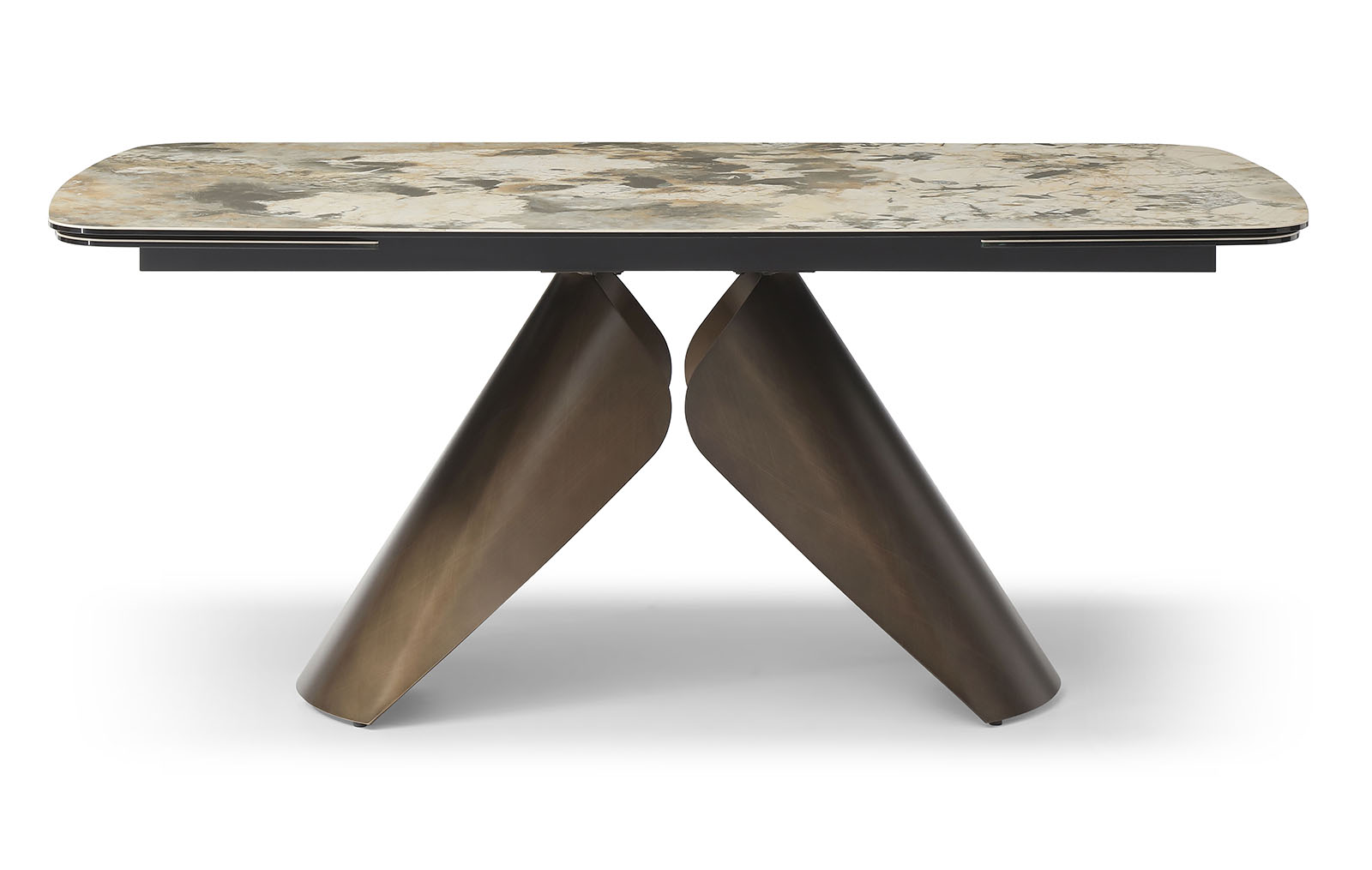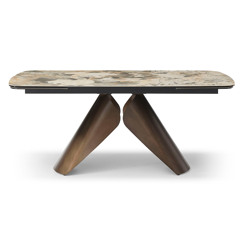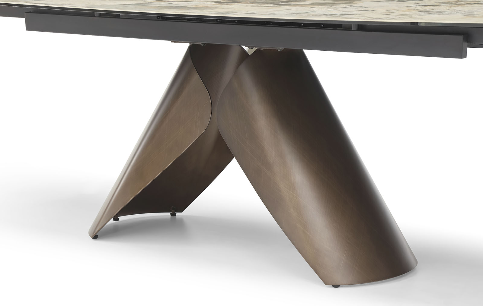 Раскладной обеденный стол Memphis (Мемфис) с керамической столешницей на металлическом подстолье в vмедно-коричневом оттенке.